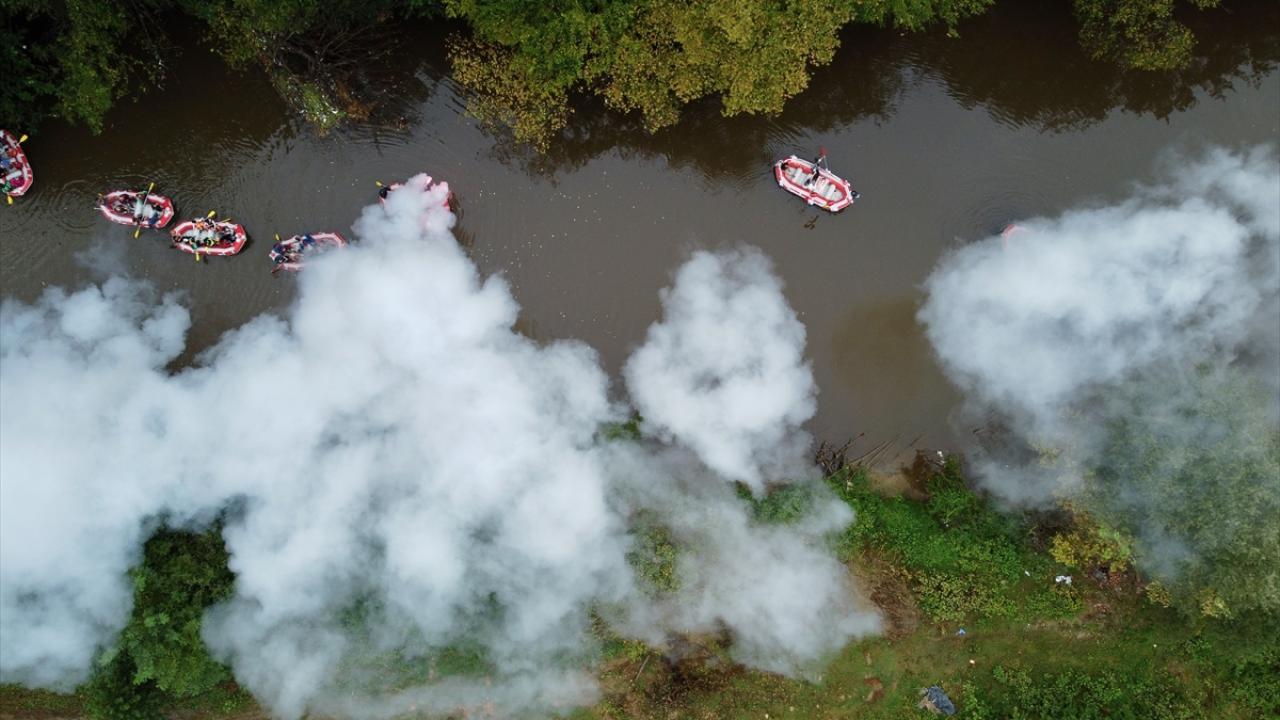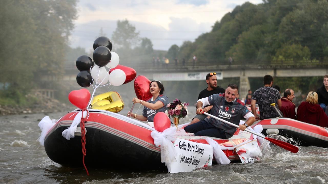 İkisi de koyu Beşiktaş taraftarı olan çift, daha sonra formaları giyip ellerine aldıkları kürekle Melen Çayı`nda diğer davetlilerle konvoy oluşturarak rafting yaptı. Misafirlerin botlarıyla çiftin önünü keserek damattan bahşiş alması renkli görüntüler oluşturdu.
