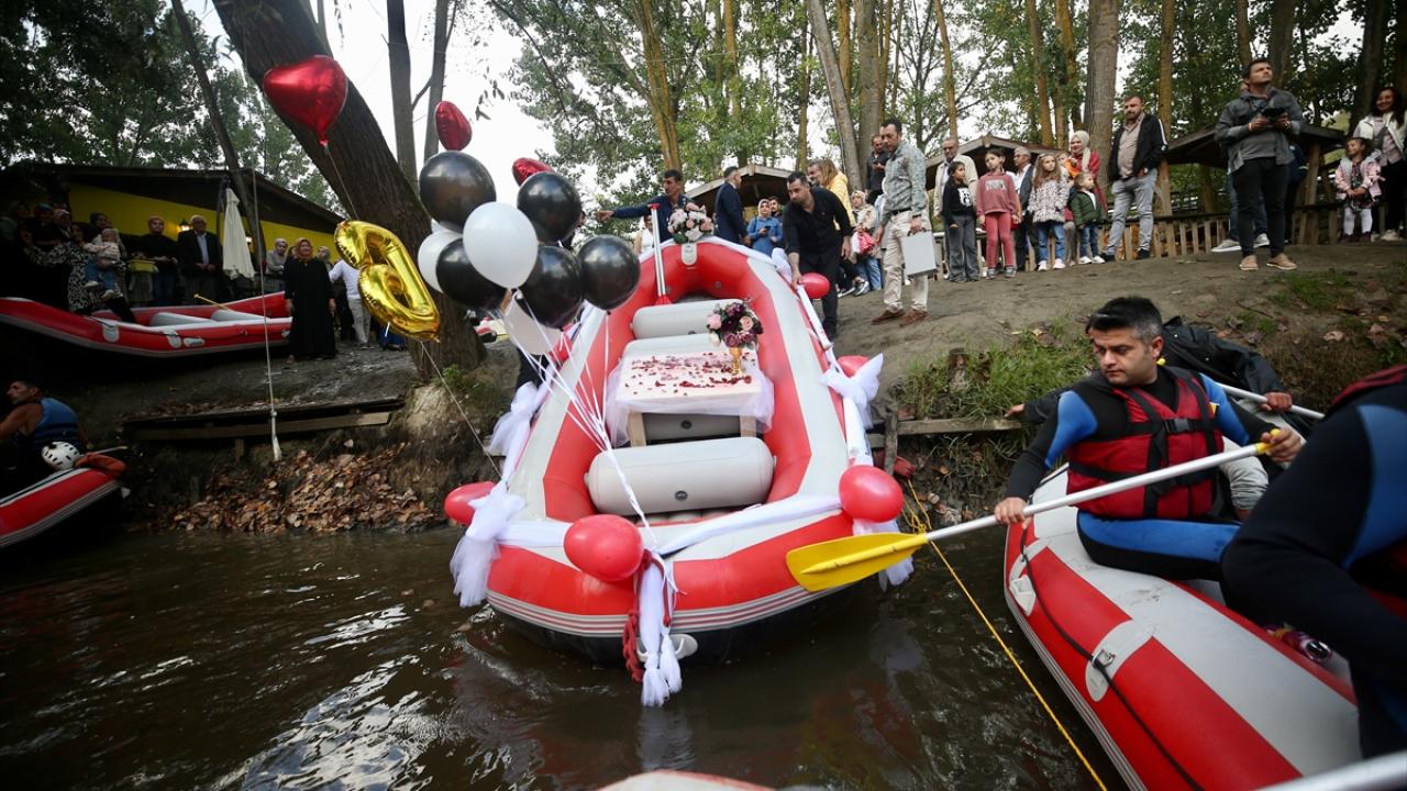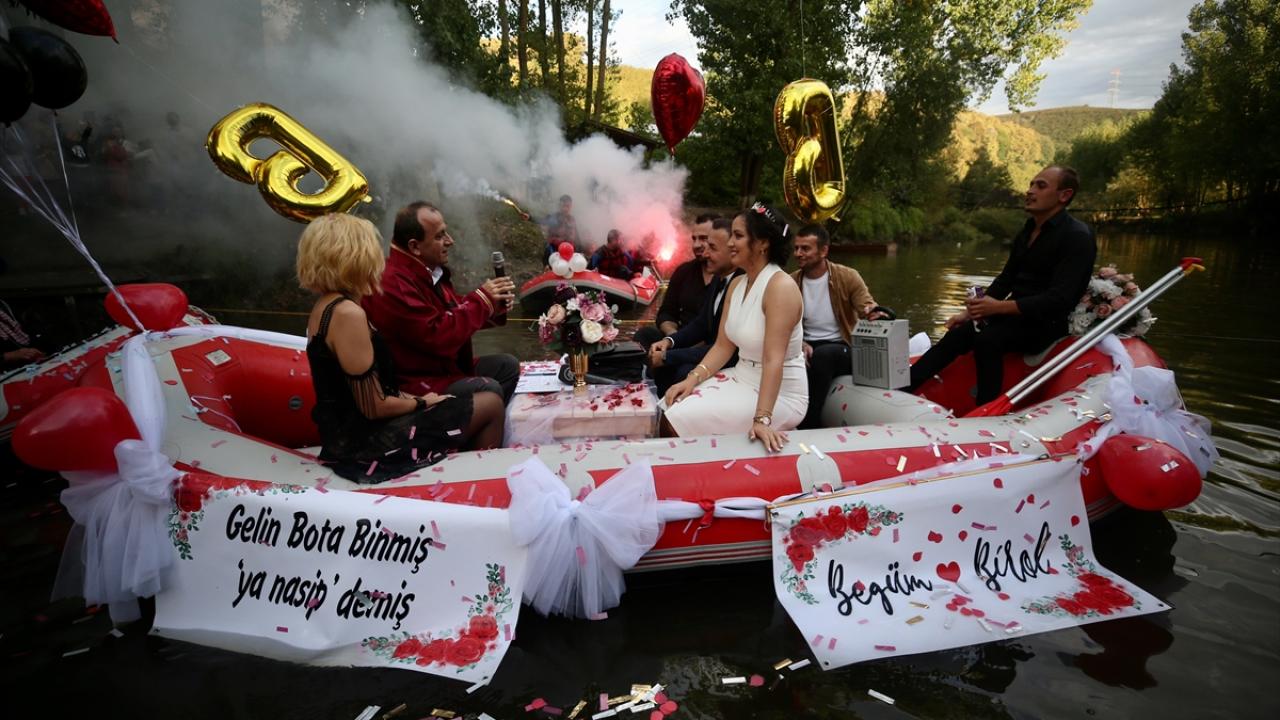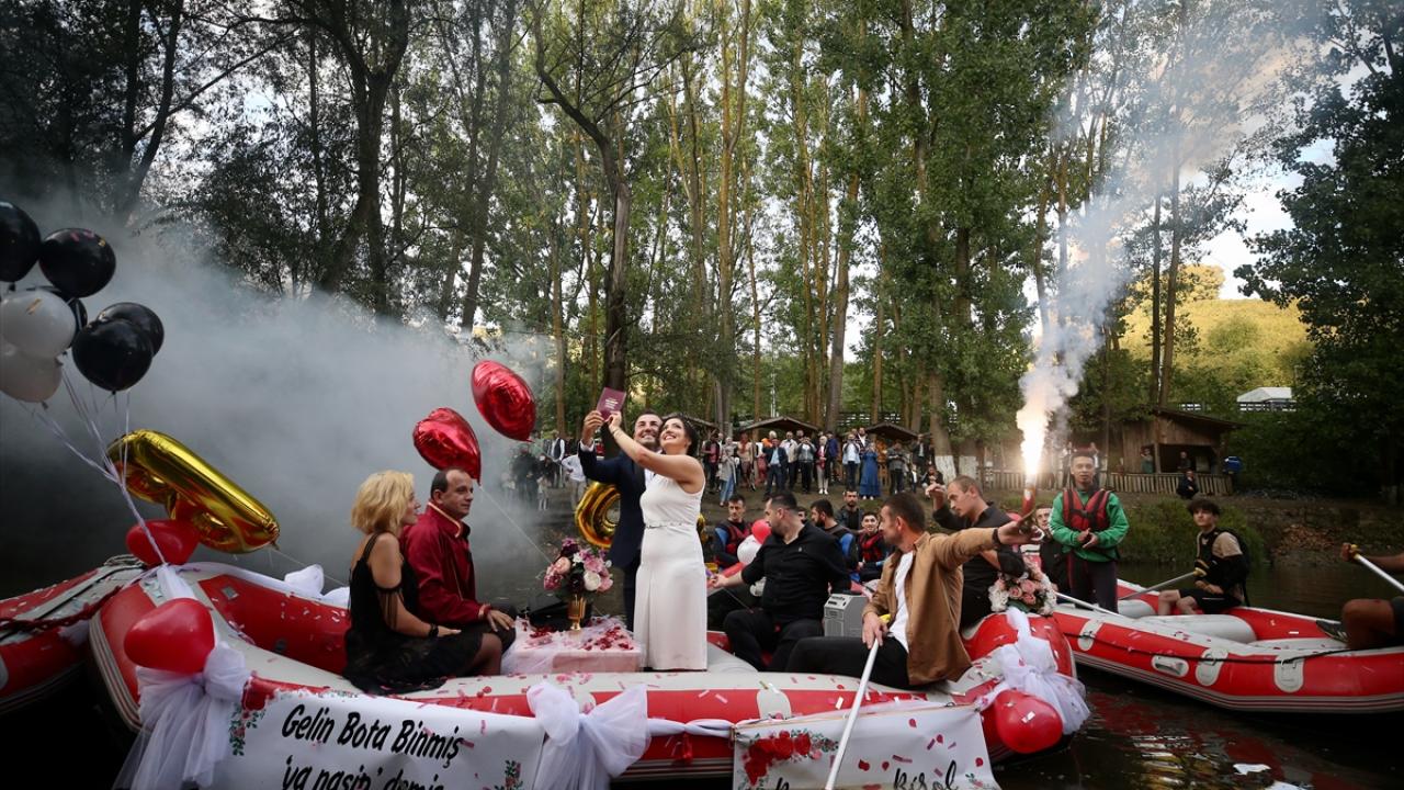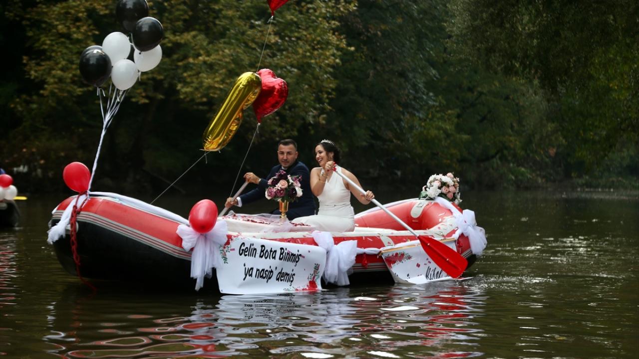Cumayeri Belediyesinden nikah günlerini alan çift, gelin aracı gibi süsledikleri rafting botuna nikah masası kurdu, "gelin bota binmiş ya nasip demiş" yazısı astı.