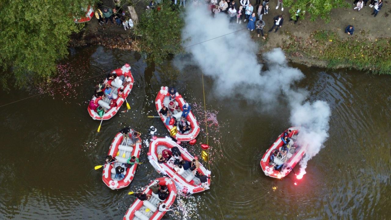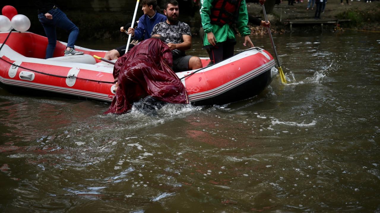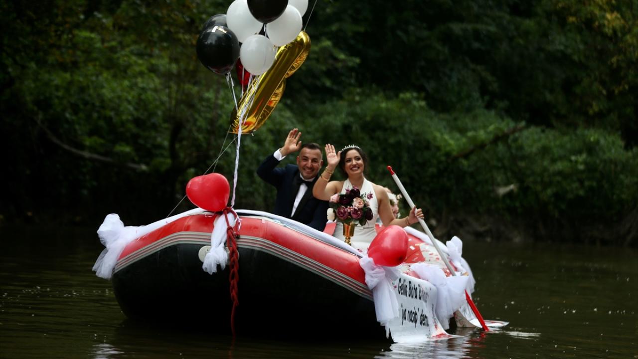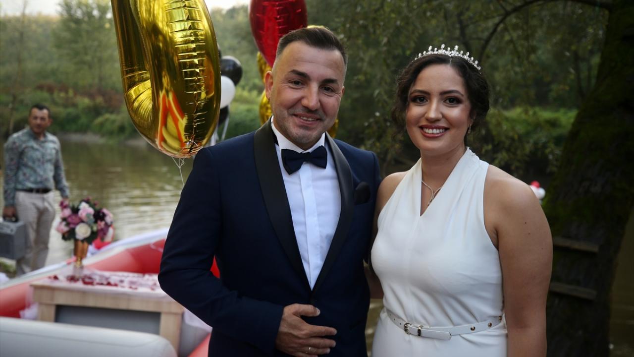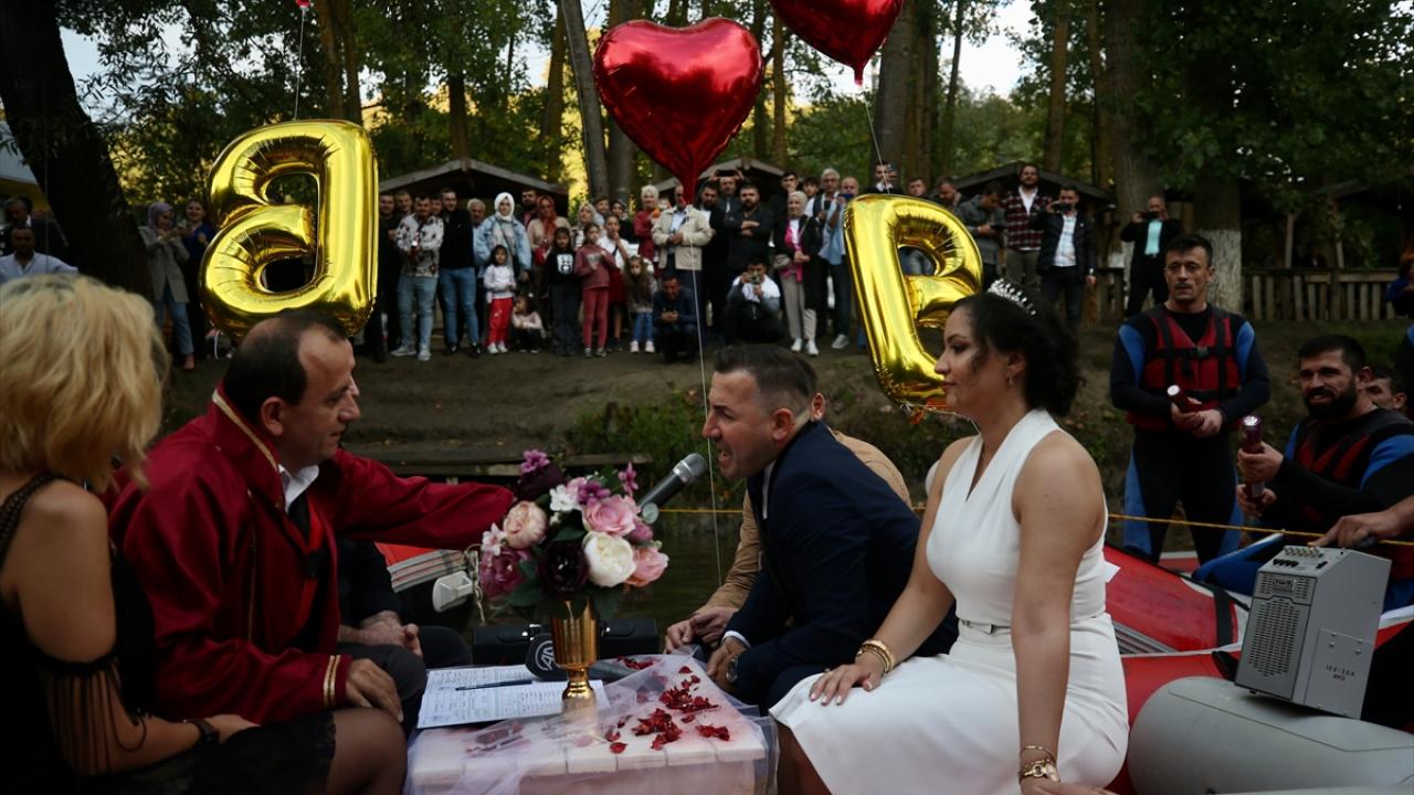 Cumayeri Belediyesinden nikah günlerini alan çift, gelin aracı gibi süsledikleri rafting botuna nikah masası kurdu, "gelin bota binmiş ya nasip demiş" yazısı astı.