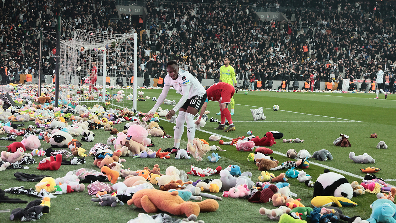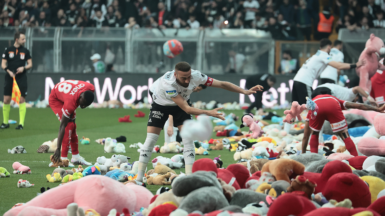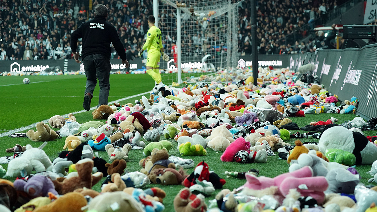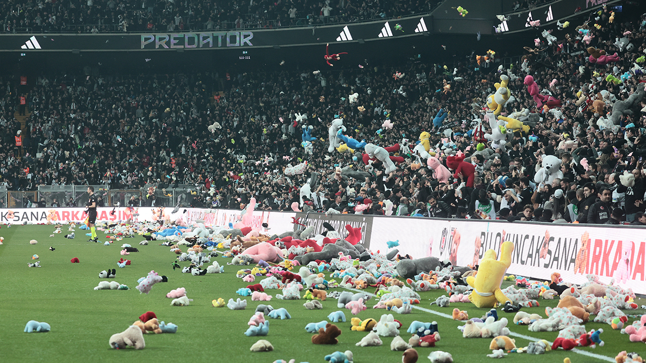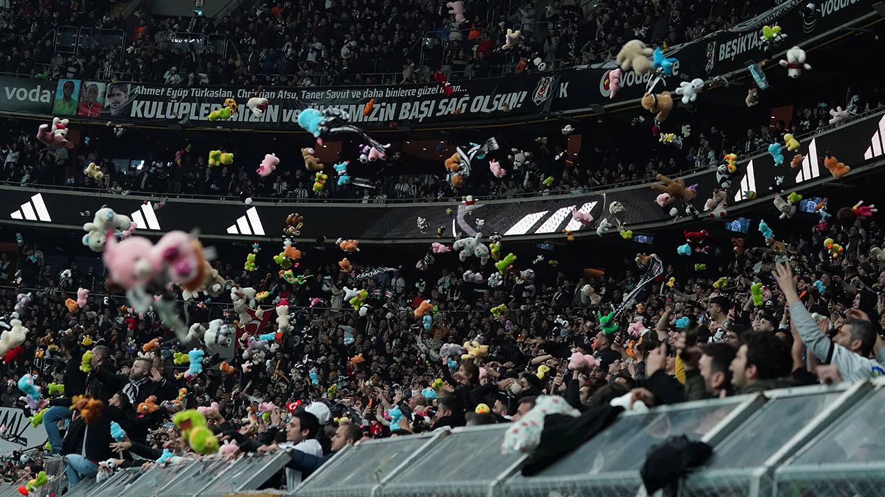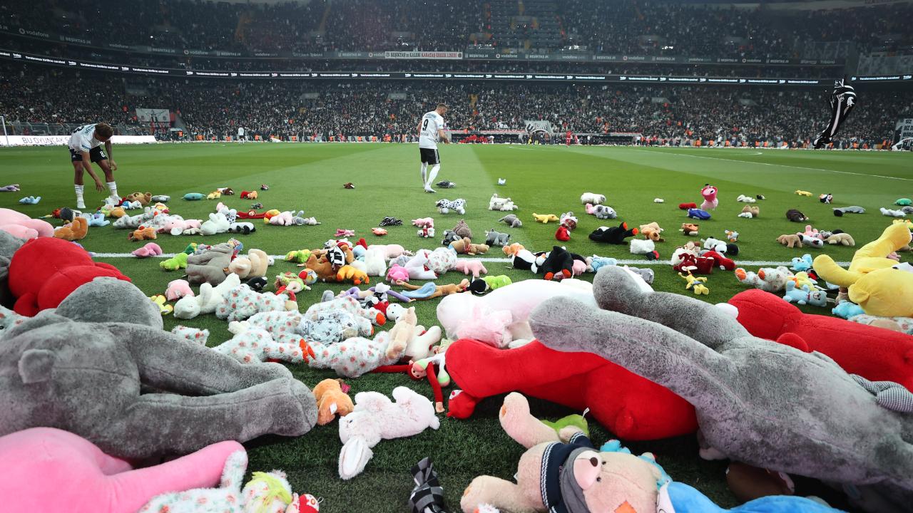 Beşiktaş ile Fraport TAV Antalyaspor arasında oynanan Spor Toto Süper Lig 14. hafta erteleme karşılaşmasının 4. dakika 17. saniyesinde taraftarlar tribünlerden binlerce oyuncak sahaya atıldı.