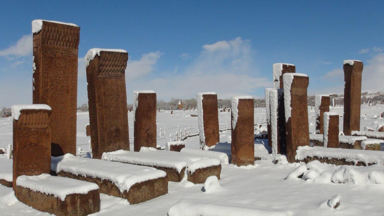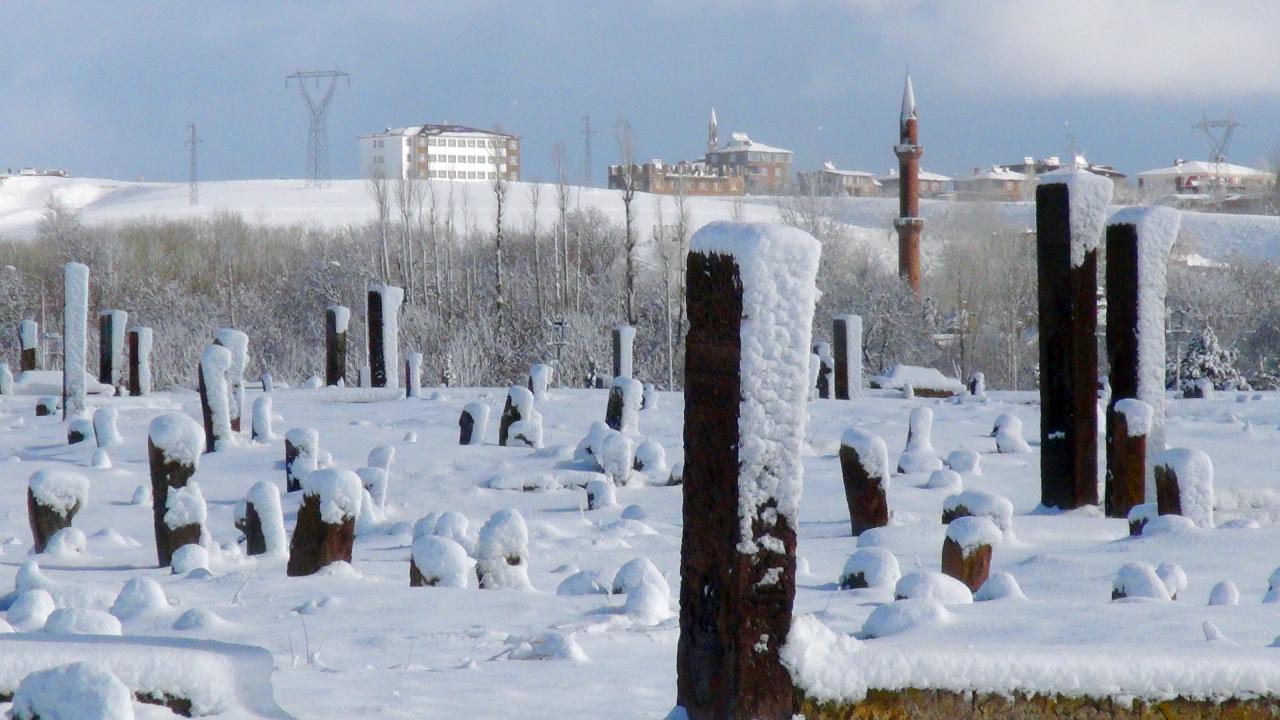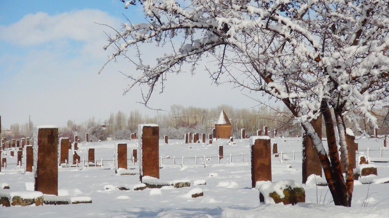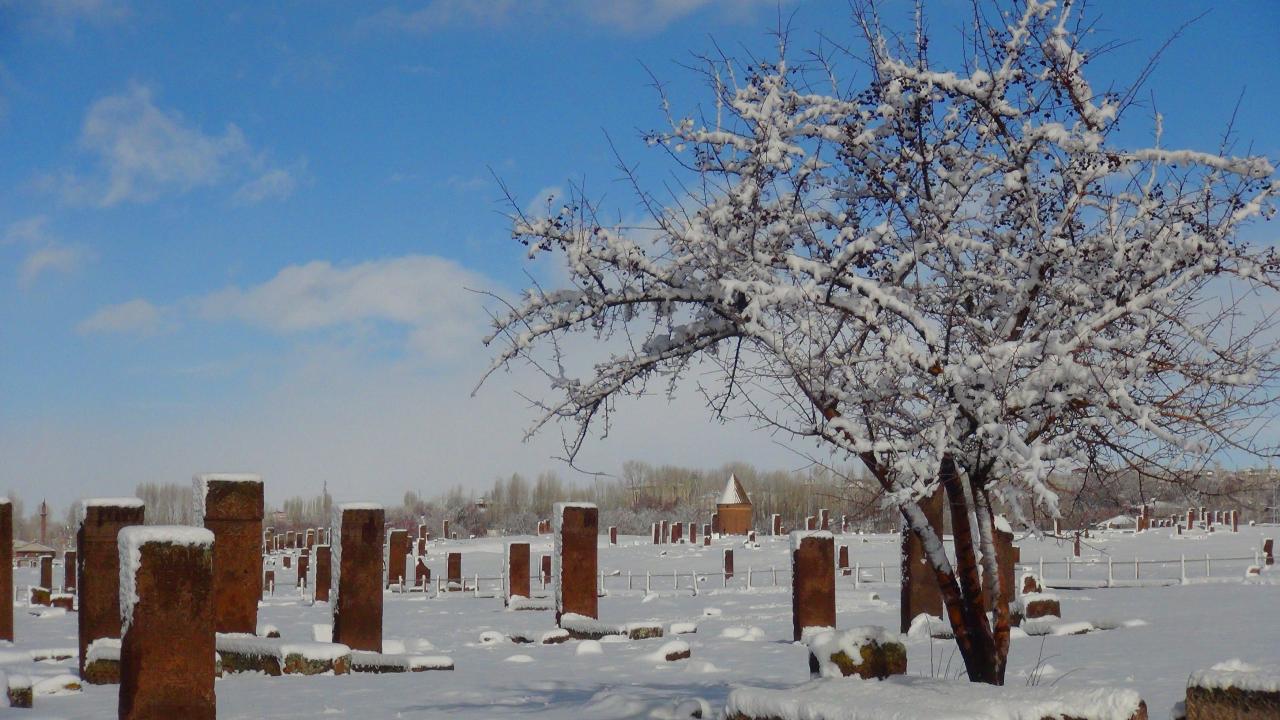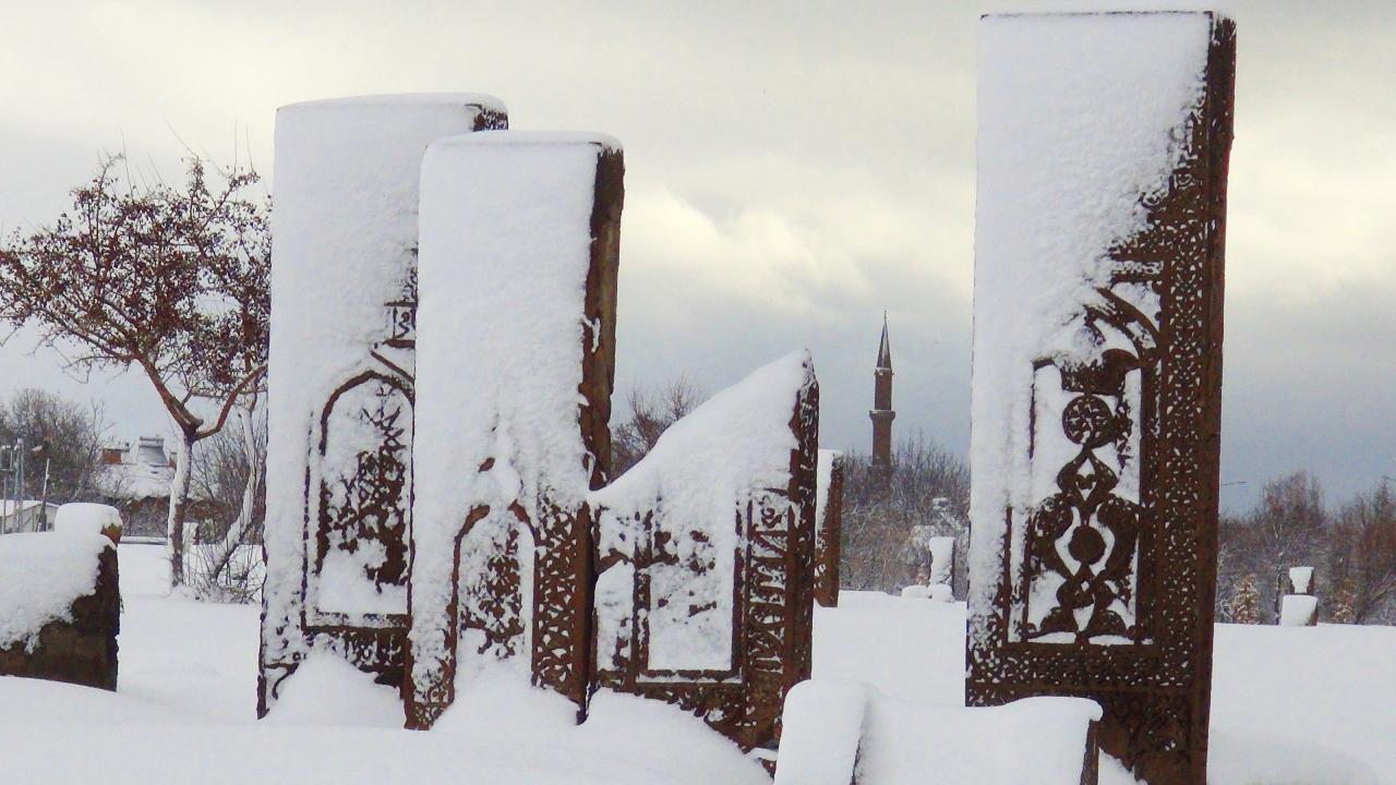 Karla ayrı bir güzelliğe bürünen dünyanın en büyük İslam mezarlığı olan Selçuklu Meydan Mezarlığı, seyri doyumsuz görüntüler oluşturuyor.