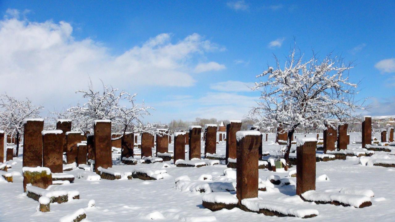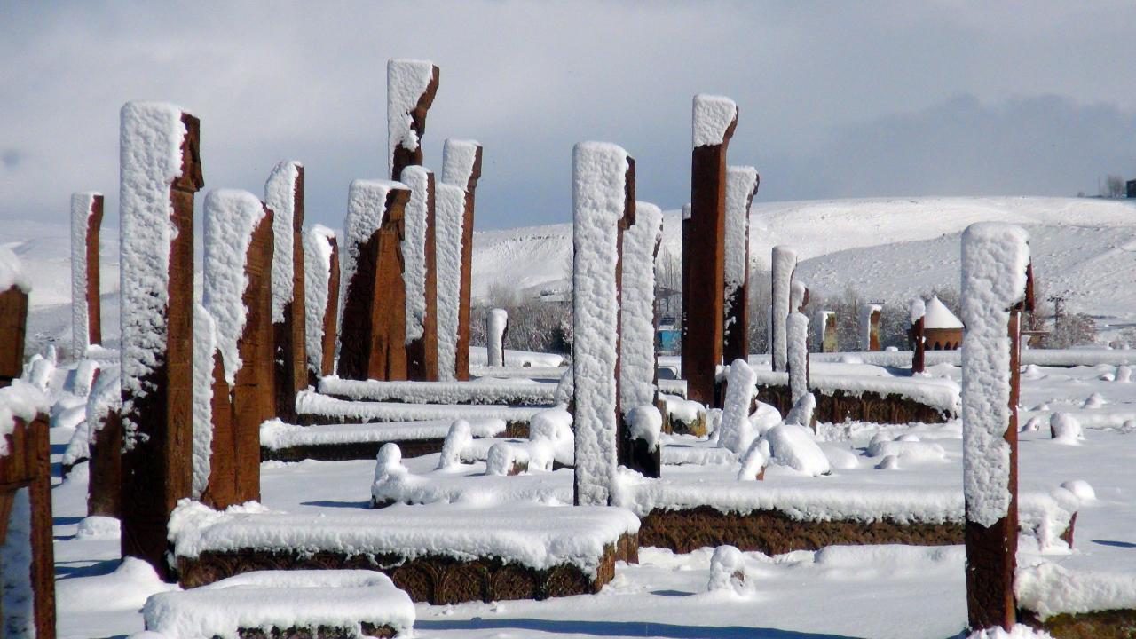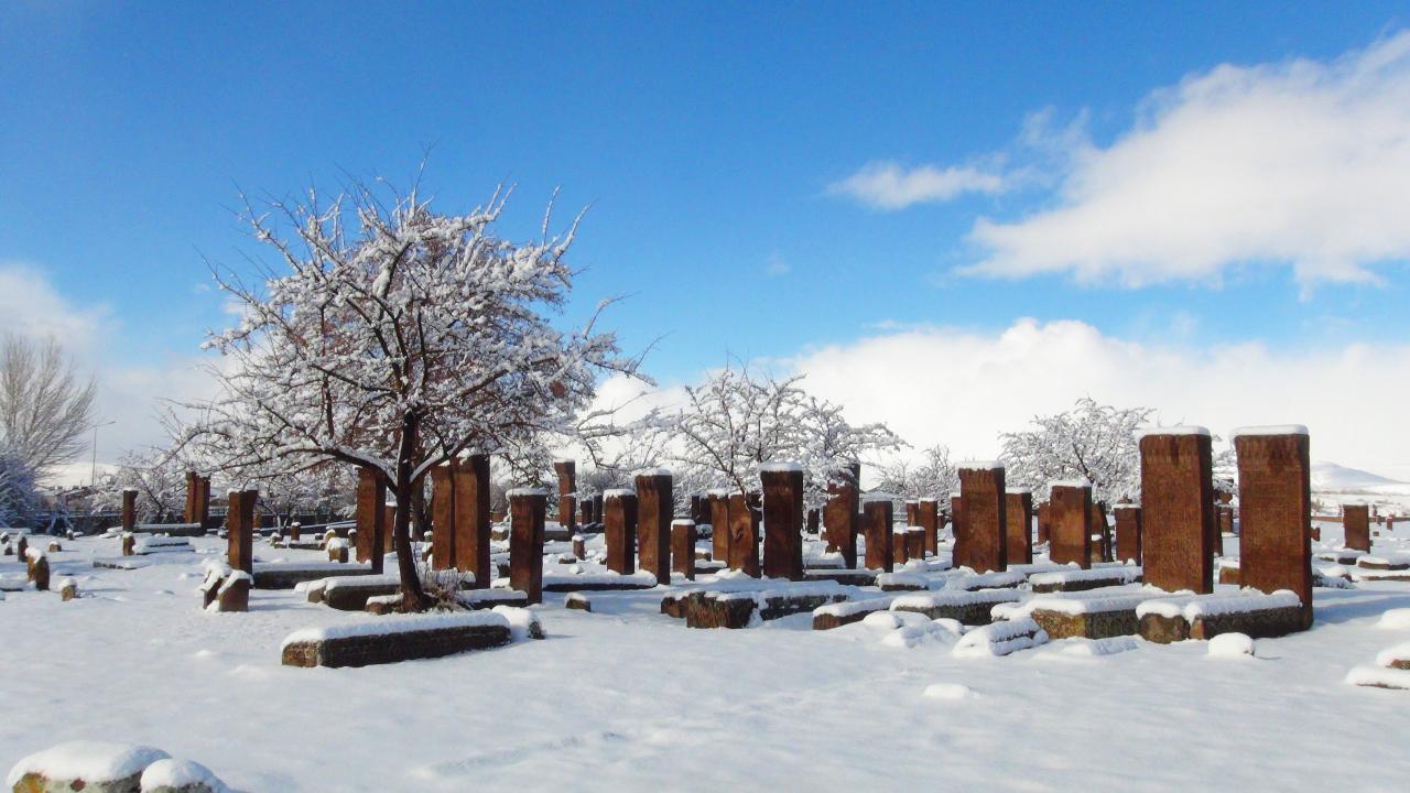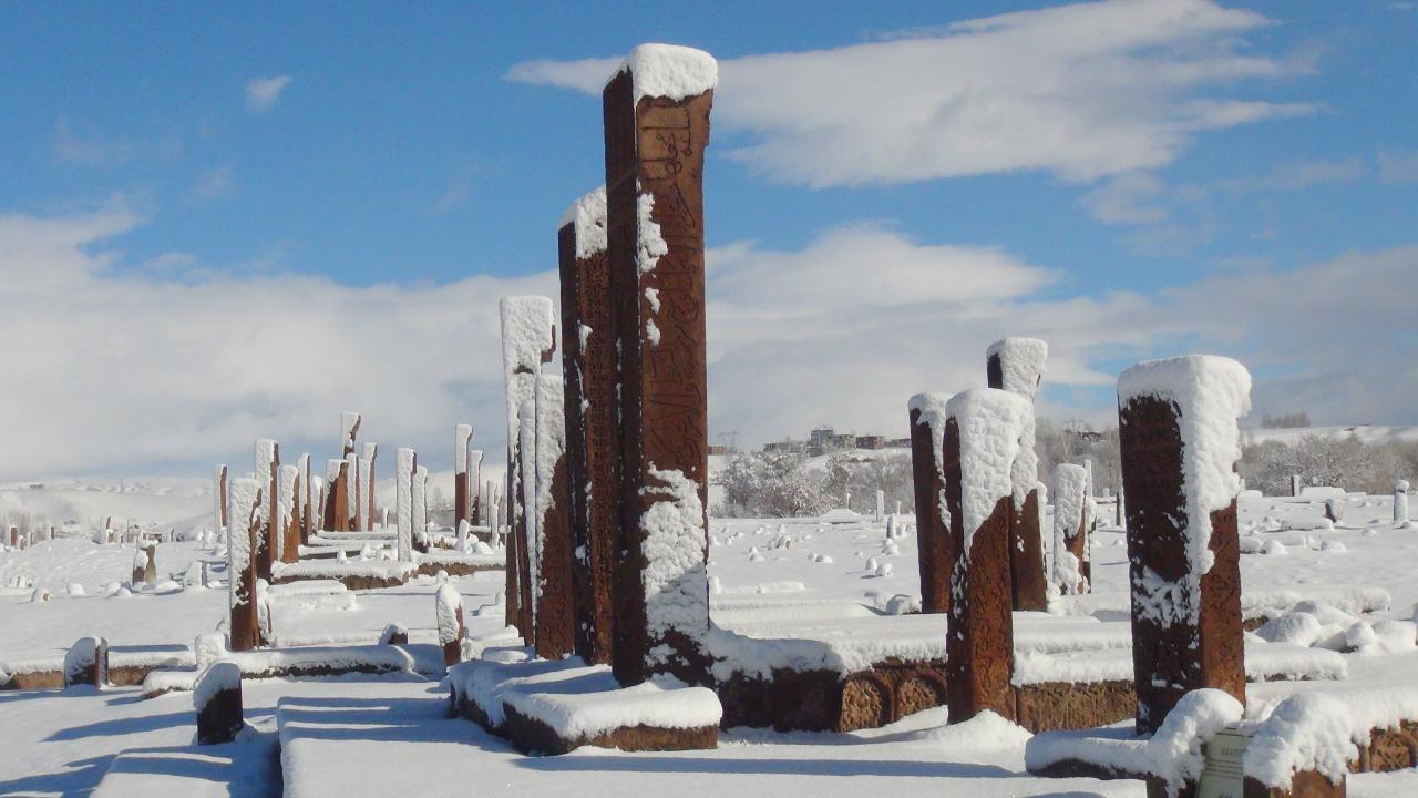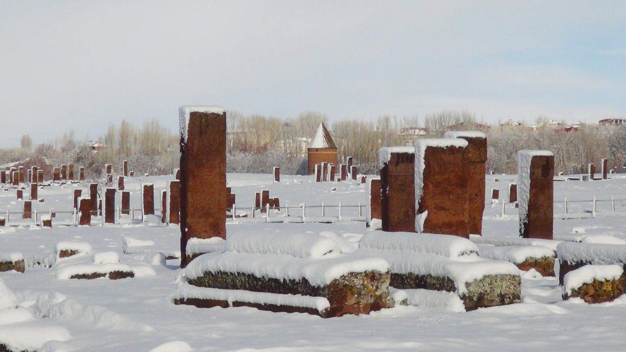 Karla ayrı bir güzelliğe bürünen dünyanın en büyük İslam mezarlığı olan Selçuklu Meydan Mezarlığı, seyri doyumsuz görüntüler oluşturuyor.