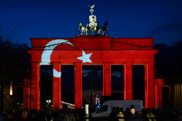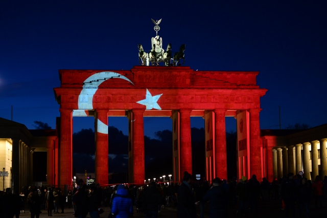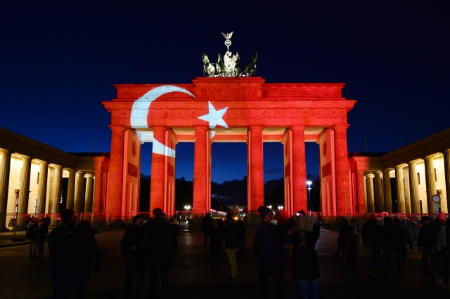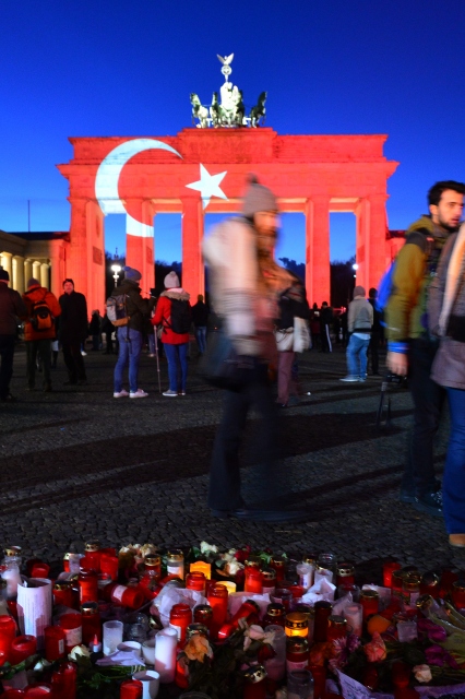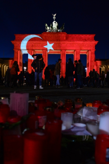 Almanya’nın başkenti Berlin’in en önemli sembollerinden olan tarihi Brandenburg Kapısı, (Brandenburger Tor) İstanbul'da Ortaköy'de bir gece kulübüne düzenlenen terör saldırısı sonrasında Türk bayrağının renklerine büründü.
