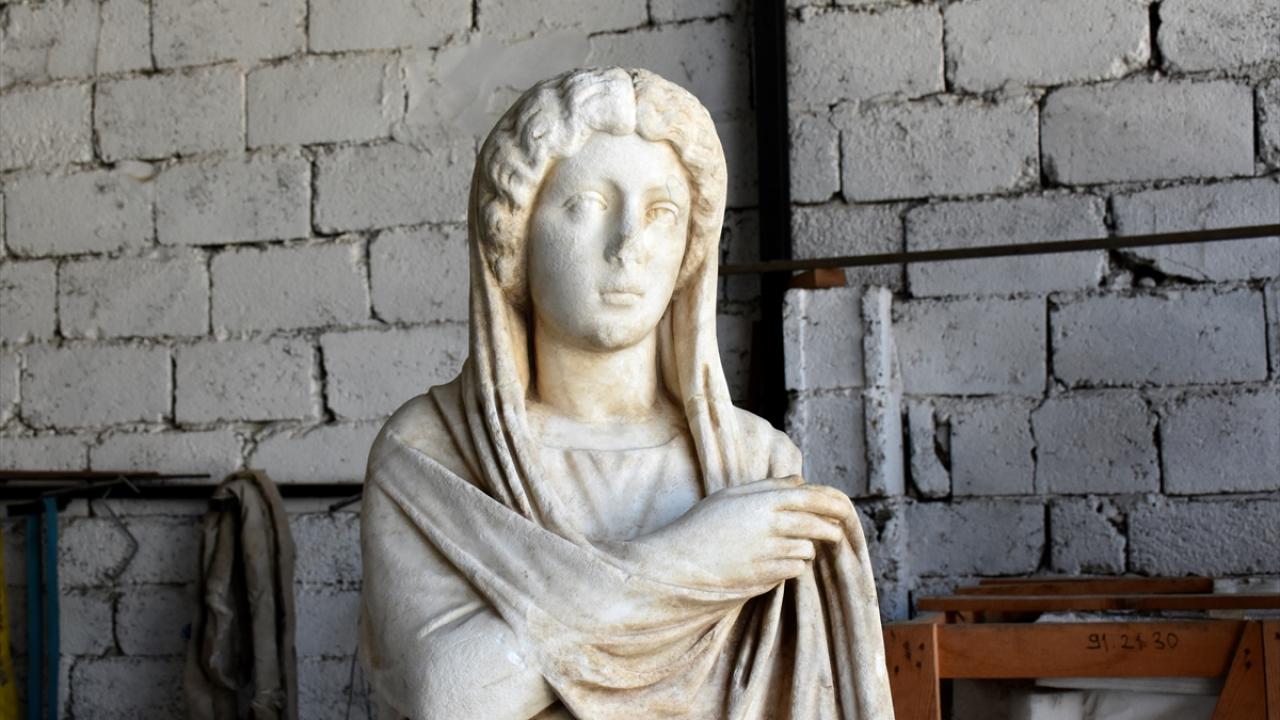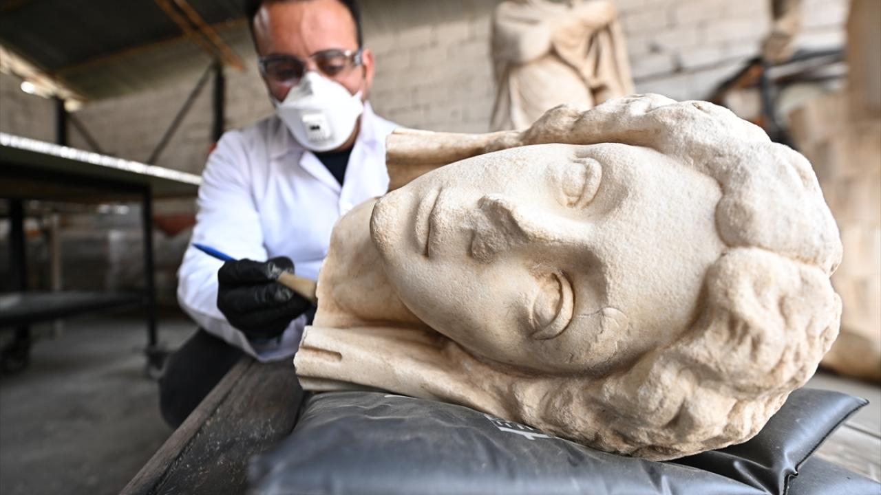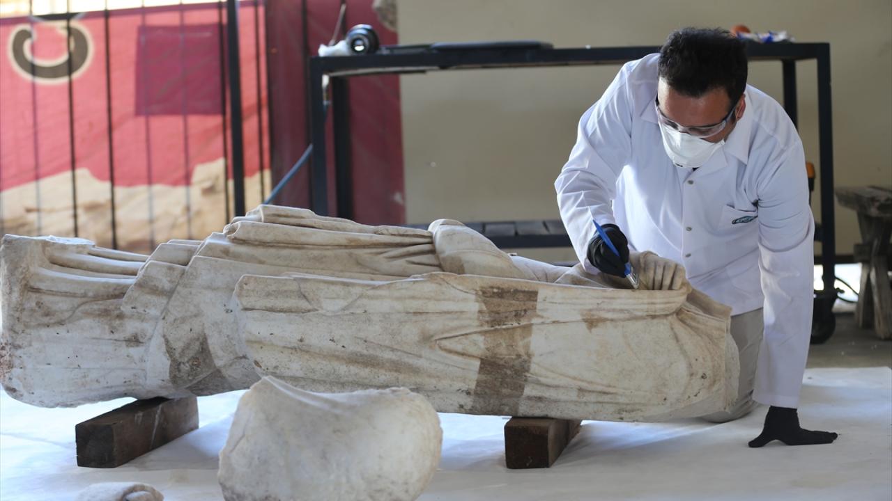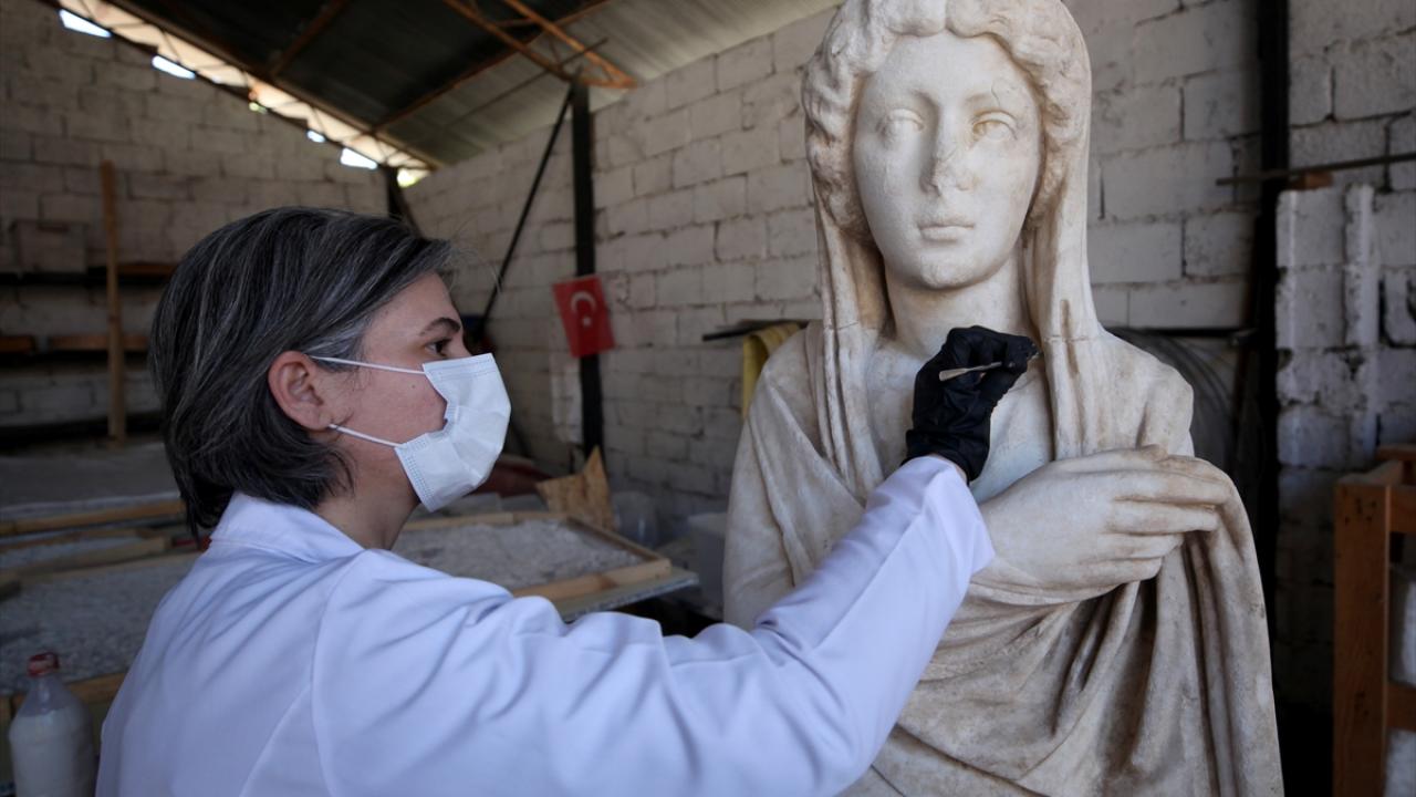 Antalya`nın Aksu ilçesindeki Perge Antik Kenti`nde, Prof. Dr. Sedef Çokay Kepçe başkanlığında yürütülen kazılarda bulunan "Giyimli Kadın" heykelinin Antalya Restorasyon ve Konservasyon Bölge Laboratuvarı Müdürlüğü ekiplerince sergiye hazırlandığı sürecin tüm aşamaları görüntülendi.