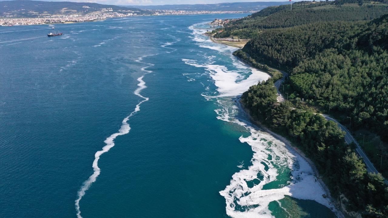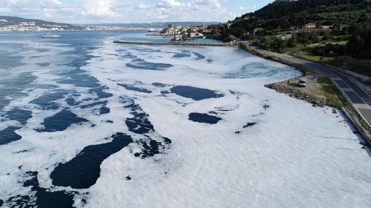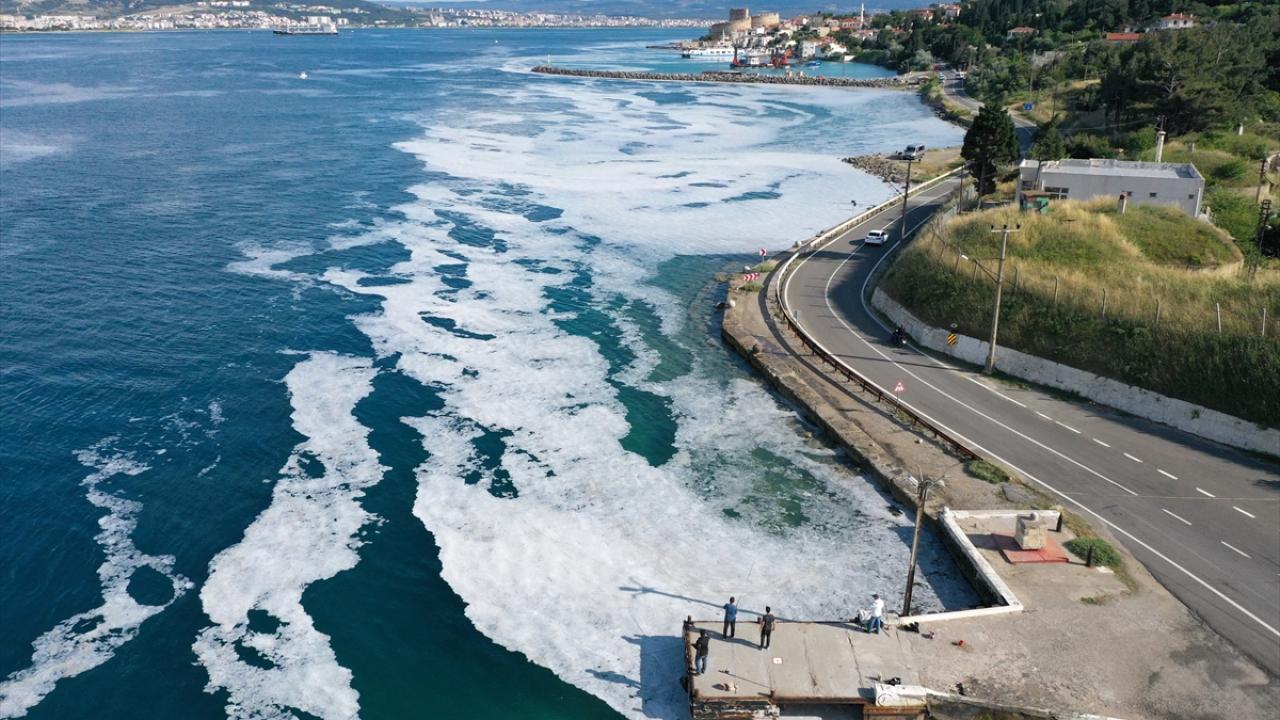 Marmara Denizi sahillerinde görülen ve rüzgarın etkisiyle kıyılara sürüklenen müsilajın (deniz salyası) Tarihi Gelibolu Yarımadası'ndaki yoğunluğu drone kamerasına yansıdı.