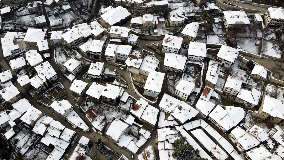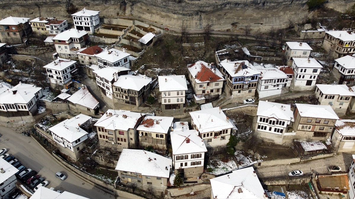 Bahçe içinde, çoğunlukla 3 katlı, 6-8 odalı, ihtiyaçlara uygun tasarlanmış ve estetik Safranbolu konakları, kar yağışıyla beyaza büründü.