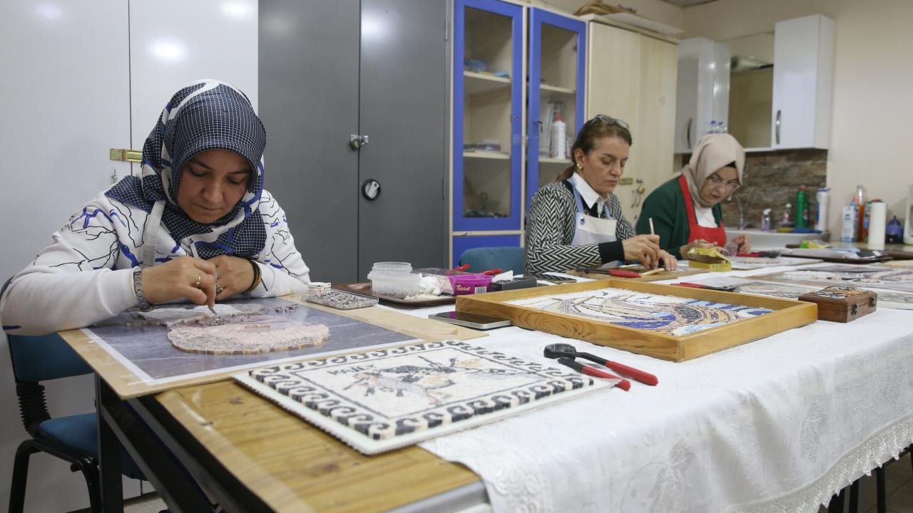 Kahramanmaraş'ta Germanicia Antik Kenti'nde ortaya çıkarılan mozaikler, halk eğitimi merkezinde açılan kursta kadın kursiyerler tarafından tablo ve dekoratif ürünlere dönüştürülerek günümüze taşınıyor.