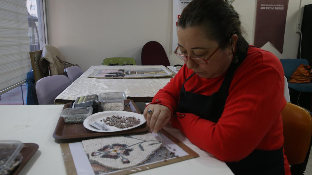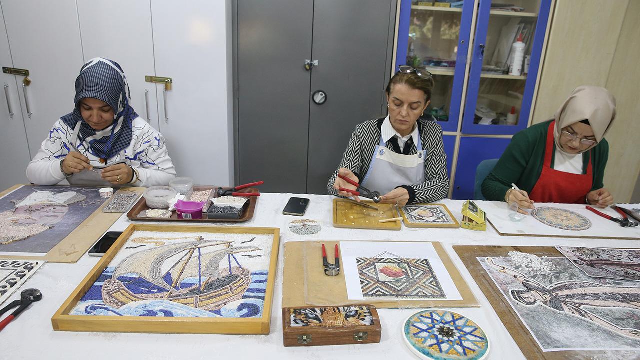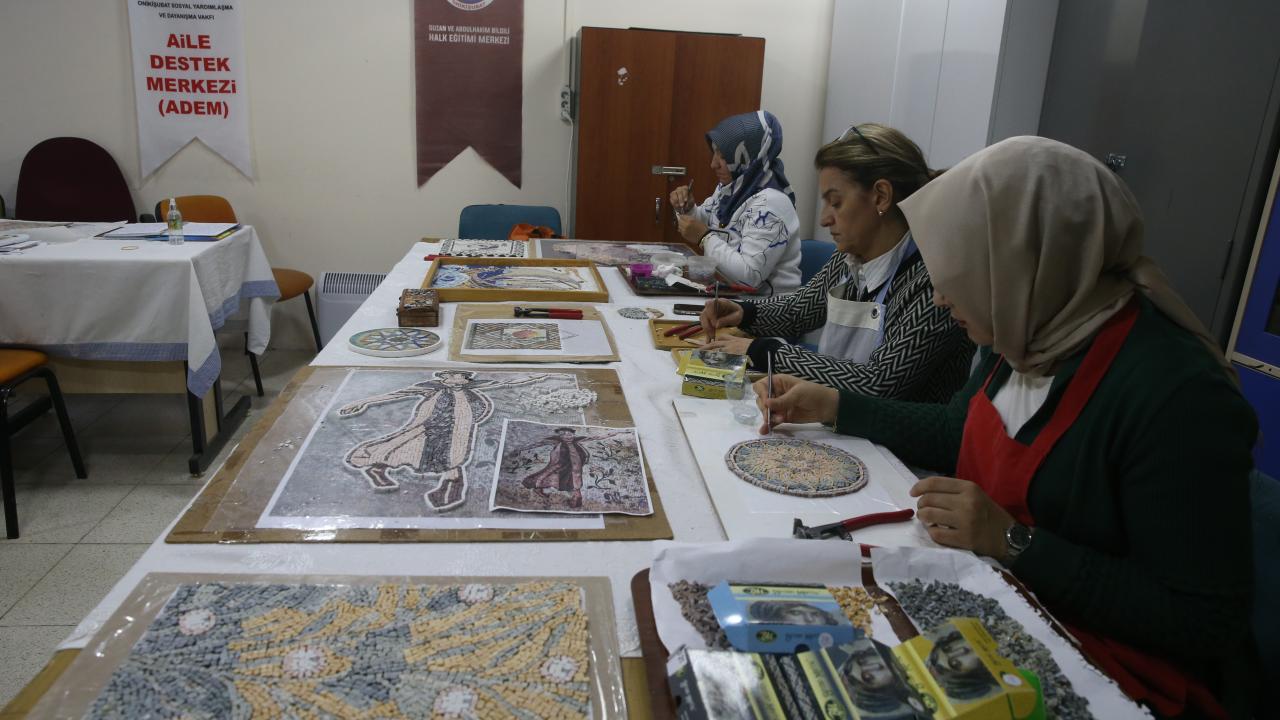 Suzan ve Abdulhakim Bilgili Halk Eğitimi Merkezi ile Onikişubat Kaymakamlığı Aile Destek Merkezi işbirliğinde açılan kursa katılan kadınlar, 2007`de kaçak kazı sonrası ortaya çıkarılan Germanicia Antik Kenti`ndeki mozaik figürleri günlük yaşamda kullanılabilecek tablo ve dekoratif ürünlere dönüştürüyor.