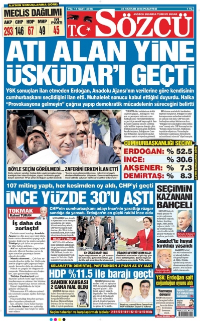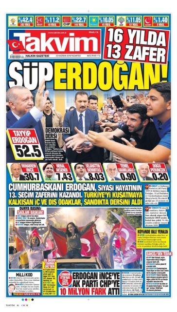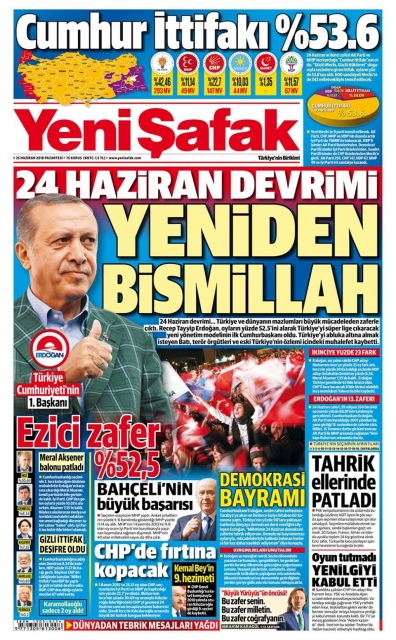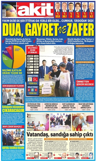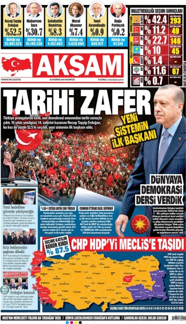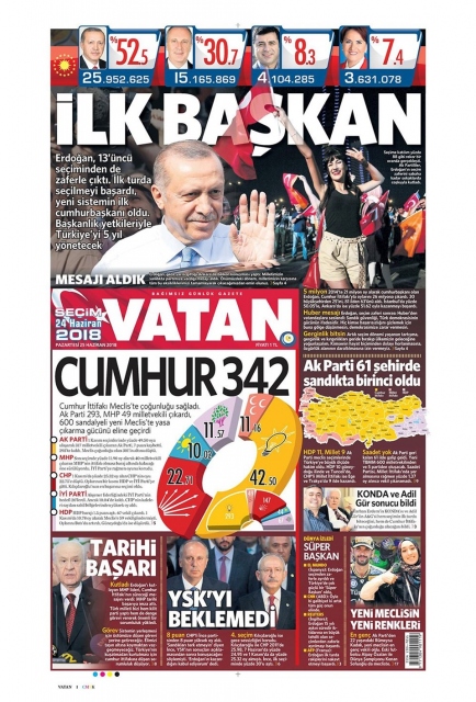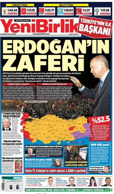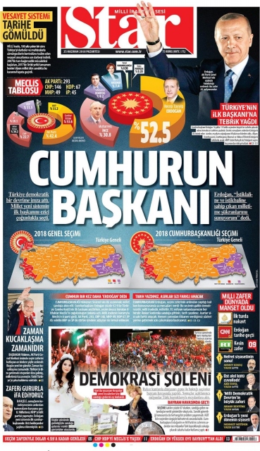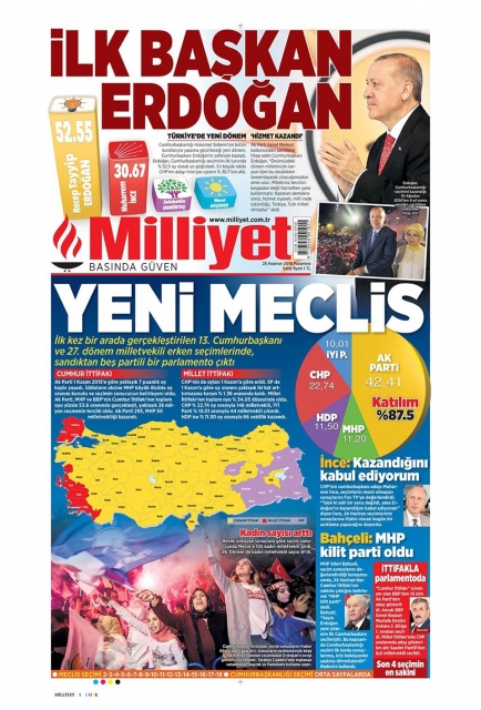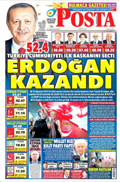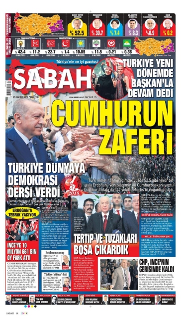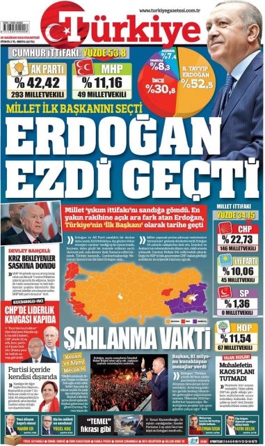 Türkiye tarihi bir seçimi geride bıraktı. Recep Tayyip Erdoğan, seçiminden zaferle çıkarak yeni sistemin ilk Cumhurbaşkanı oldu. İşte bugünün gazete manşetleri.