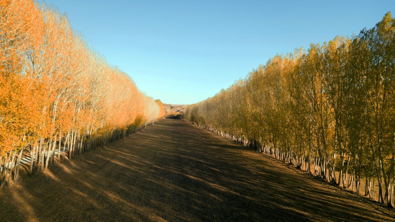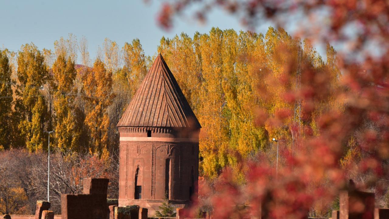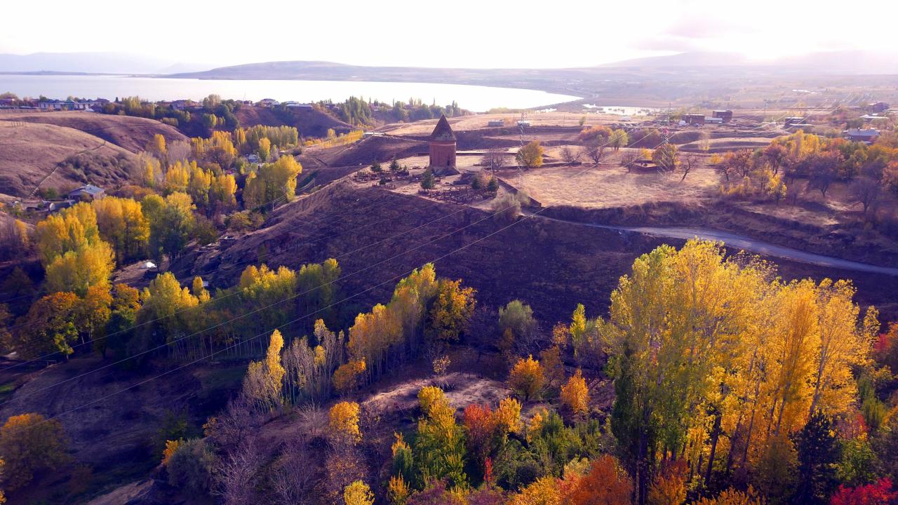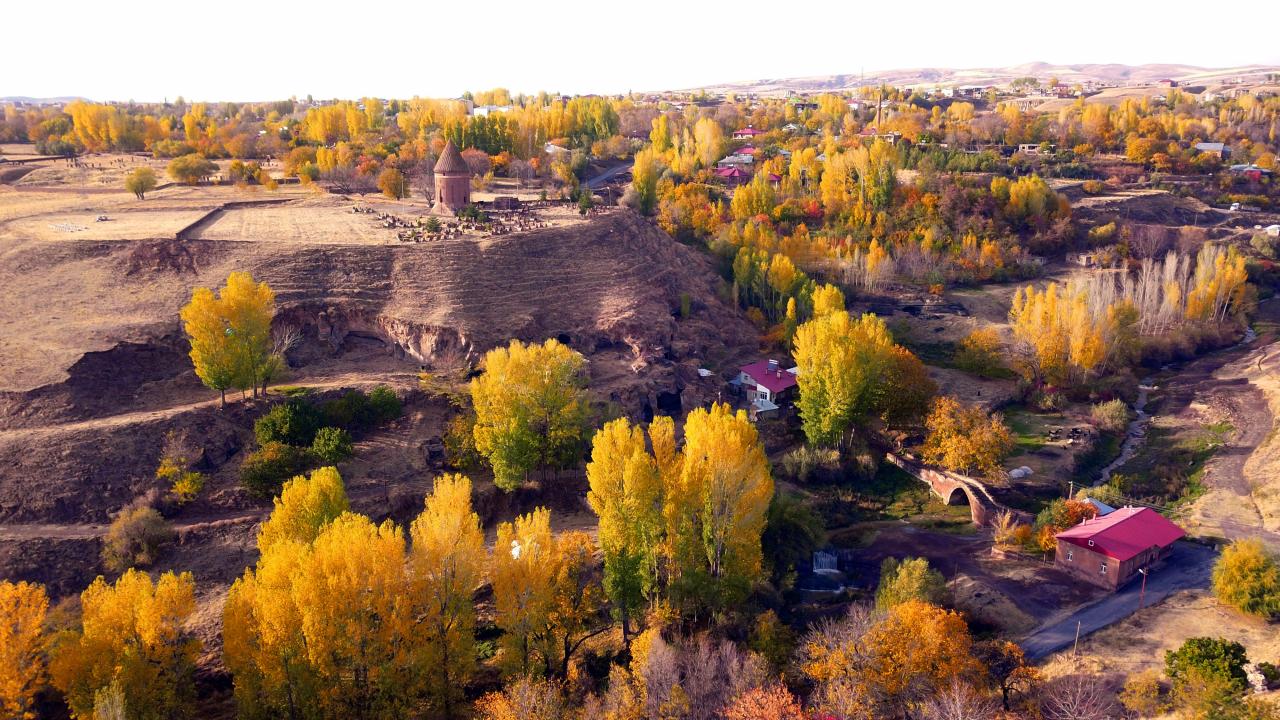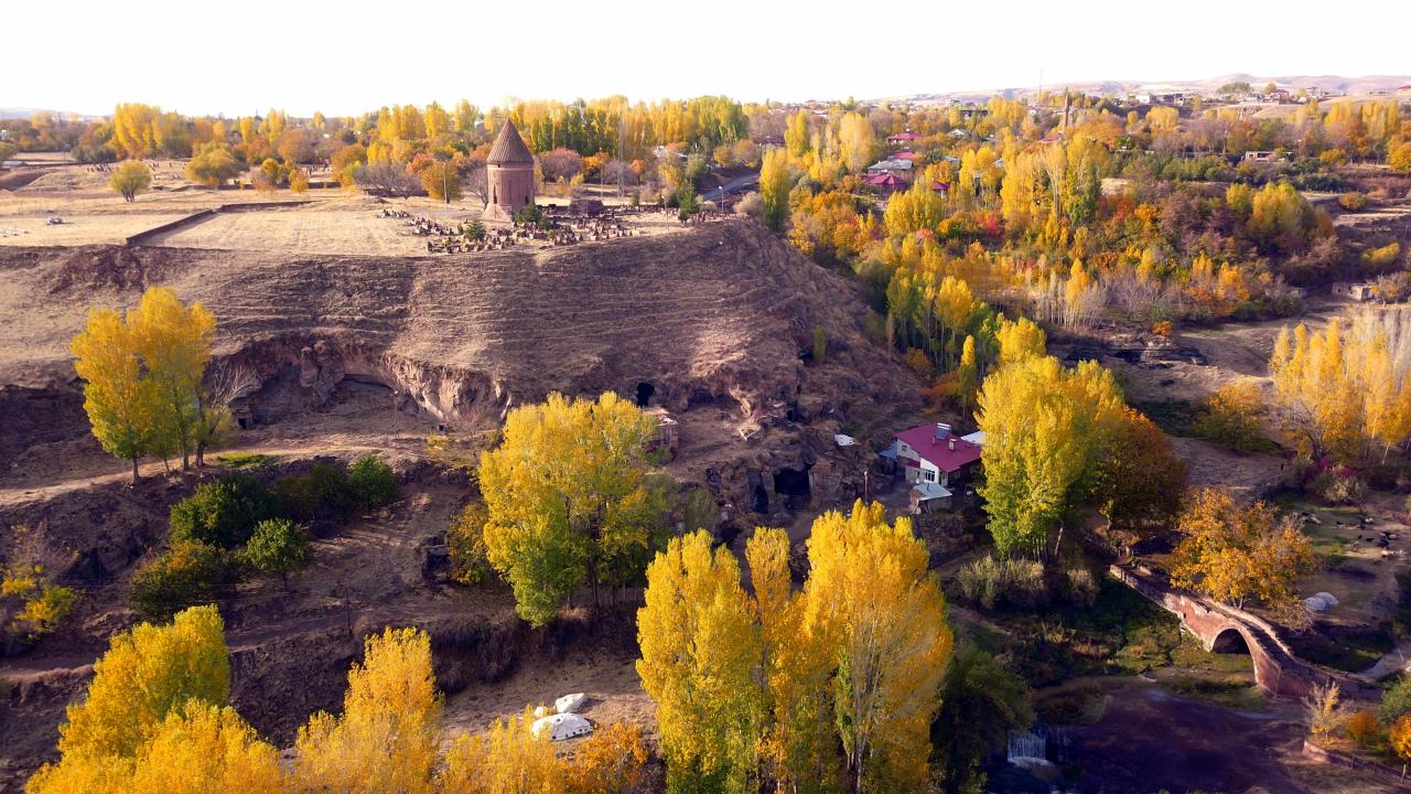 Tarihi yapıların çevresinde bulunan ağaçların sararmasıyla ortaya çıkan manzara, dronla görüntülendi.