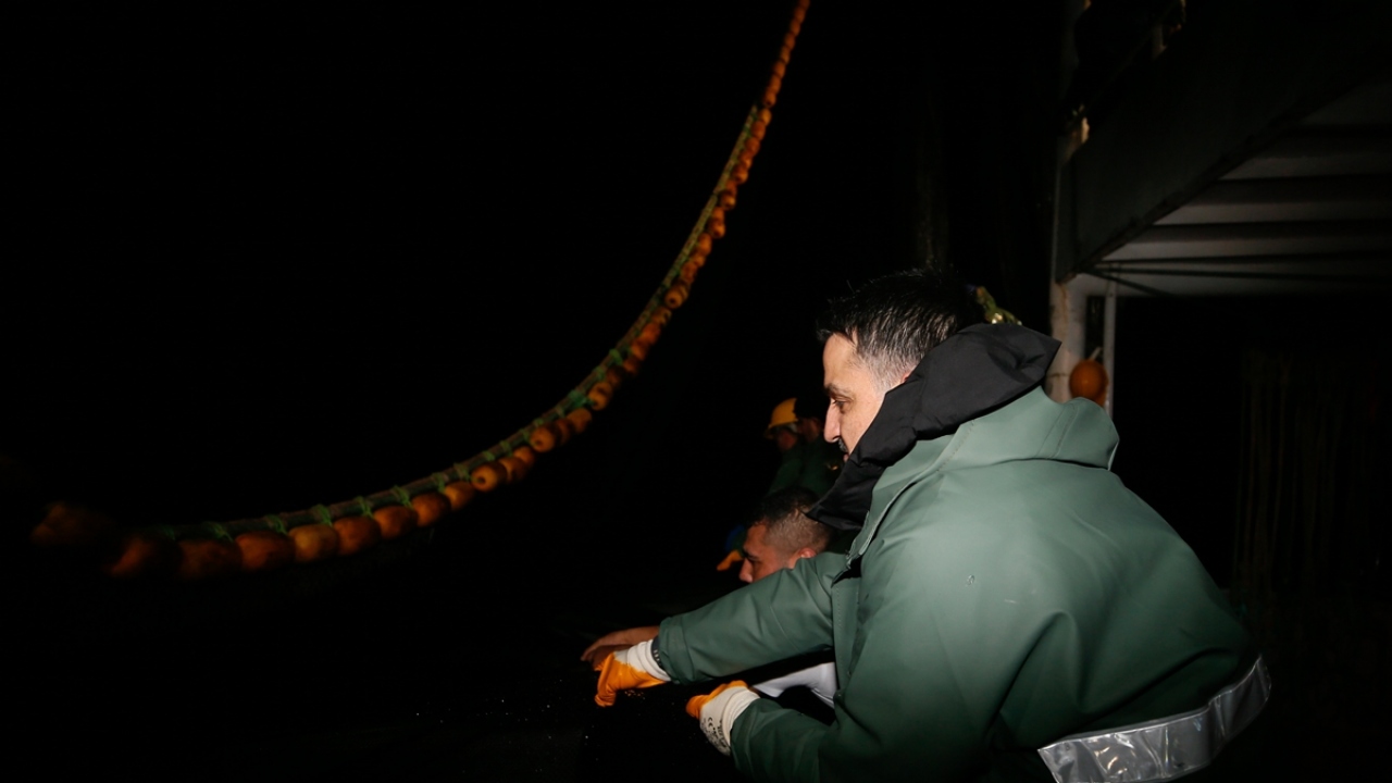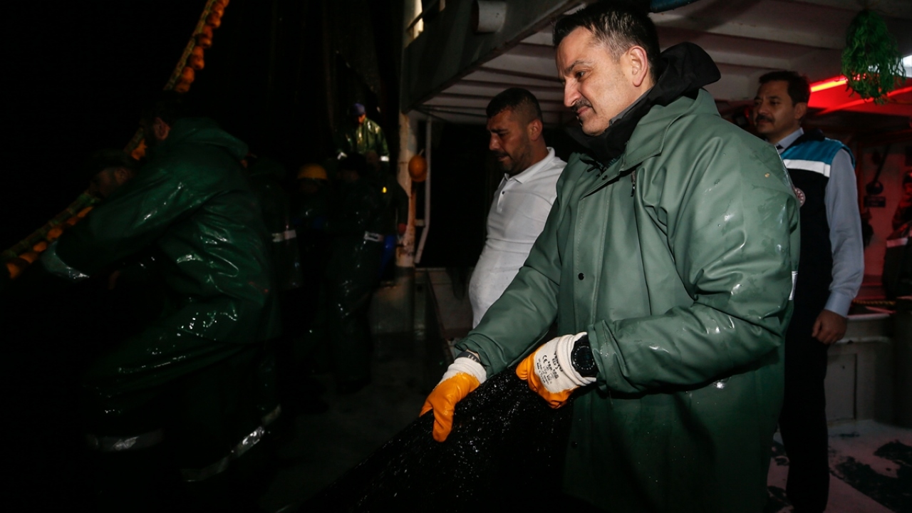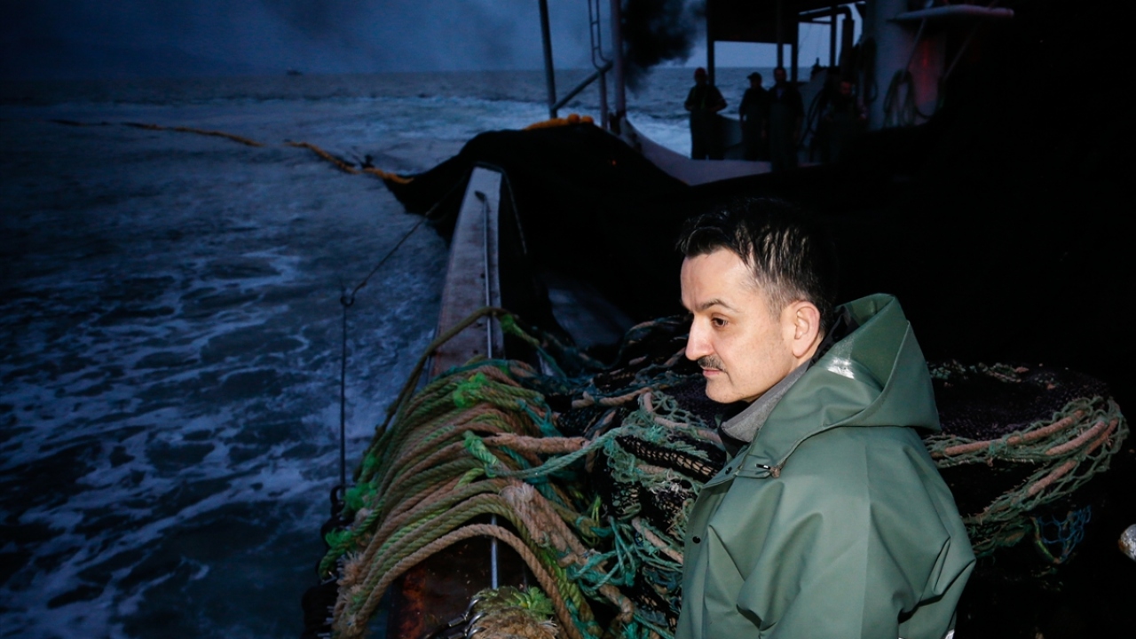 Teknede bulunan radarlardan balık sürüsünün bulunduğu alanın tespit edilmesinin ardından Pakdemirli, yağmurluk, çizme ve eldiven giyerek tayfayla teknede ağların bulunduğu kısma gitti.
