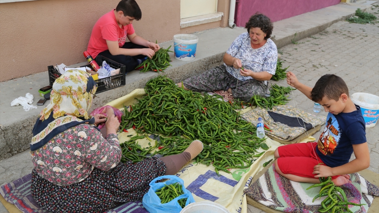 Karaağaç biberini kuruması için ipe dizen Nursel Çık da "İğne iplikle biberlerimizi diziyoruz. Mahallemizin kadınları bu işi yıllardır yapıyor. Hem oyalanıyoruz hem de ev ekonomimize katkıda bulunuyoruz. Emekliyim, 12 yıldır biber diziyorum. Ciğerciler bizden aldıkları biberleri, hazırladıkları özel yerlerde rüzgarda kurutuyor." dedi.