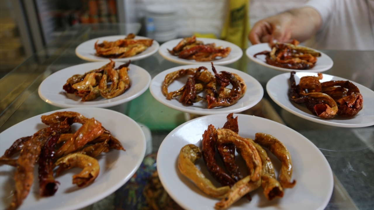 Tarladan toplanması sonrası iki ayda kurutulan acı biberler, yağda kızartılarak müşterilere sunuluyor.