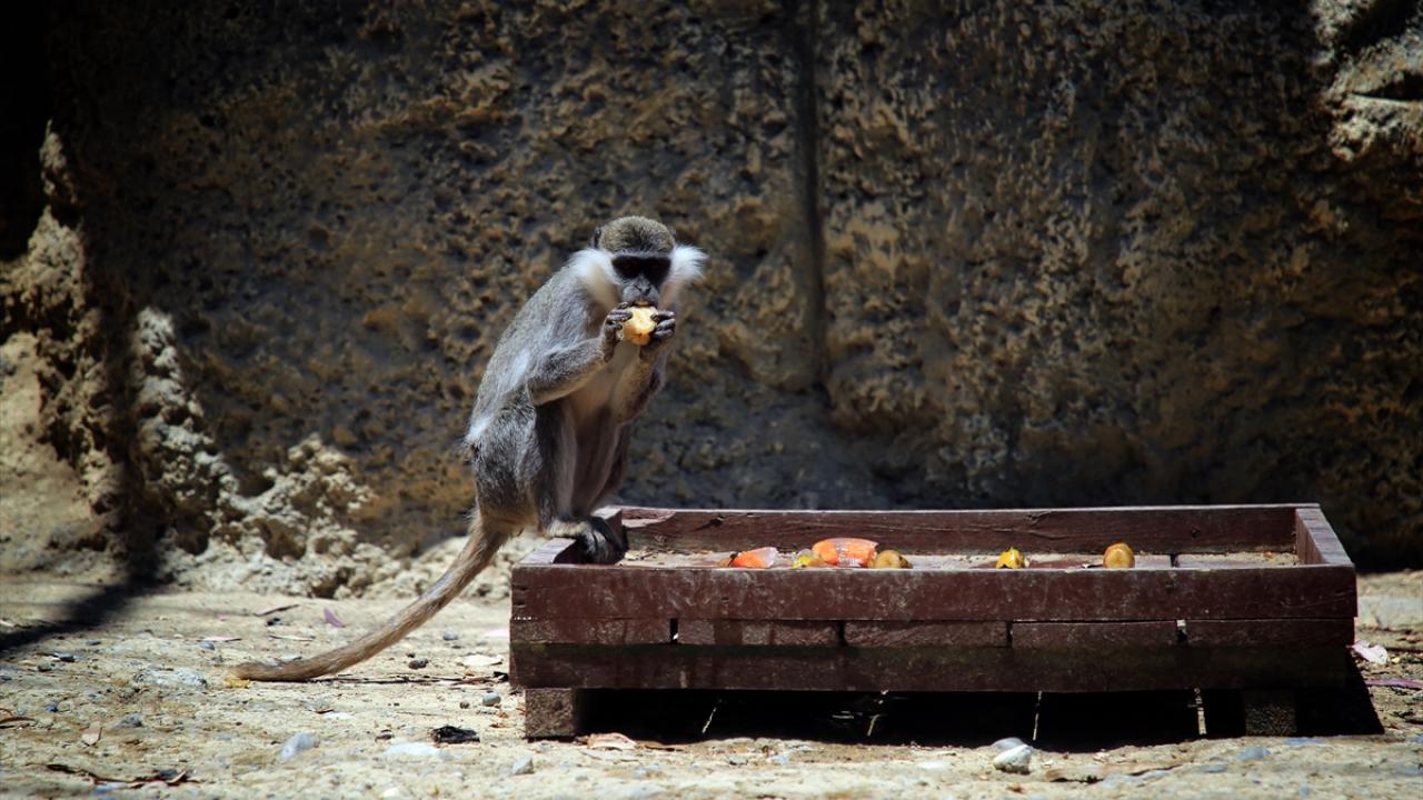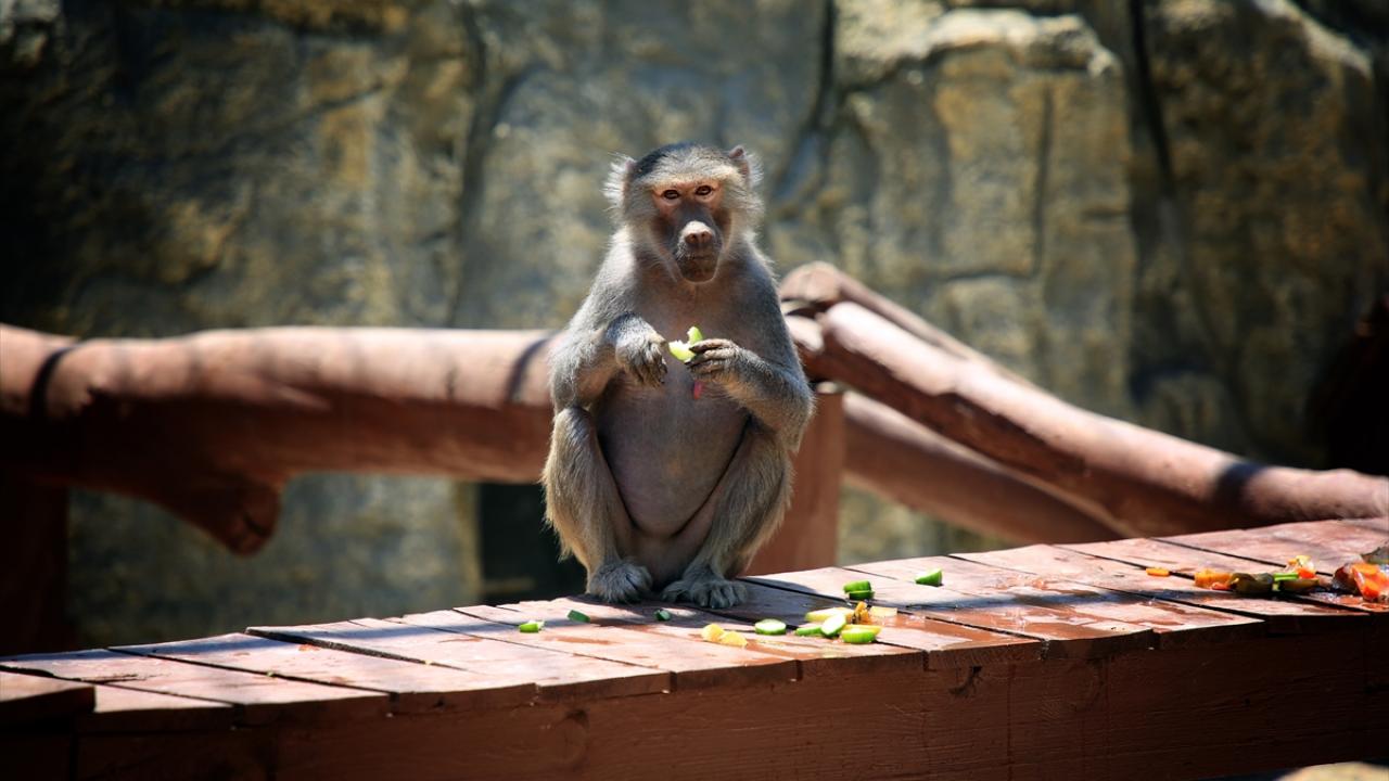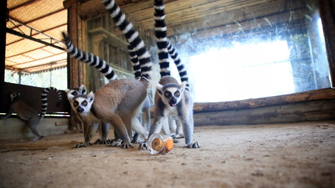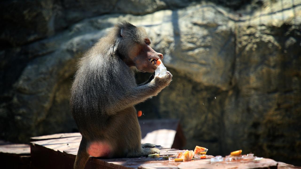 Parktaki ayı, lemur ve maymunlara karpuz veriliyor. Hayvanlar elma, portakal, kivi, çilek, muz ve üzümden oluşan buzlu meyve kokteyli ile besleniyor.