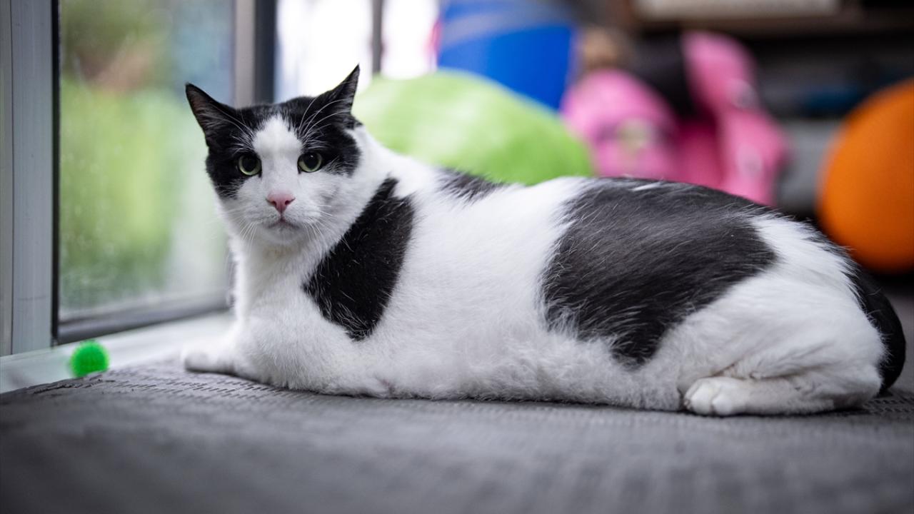 Fazla kiloya bağlı hareket kısıtlılığı yaşadığı belirlenen kedinin, diyet programı oluşturuldu, kilo vermesine ve hareket kabiliyetini artırmaya yönelik egzersiz süreci başlatıldı.