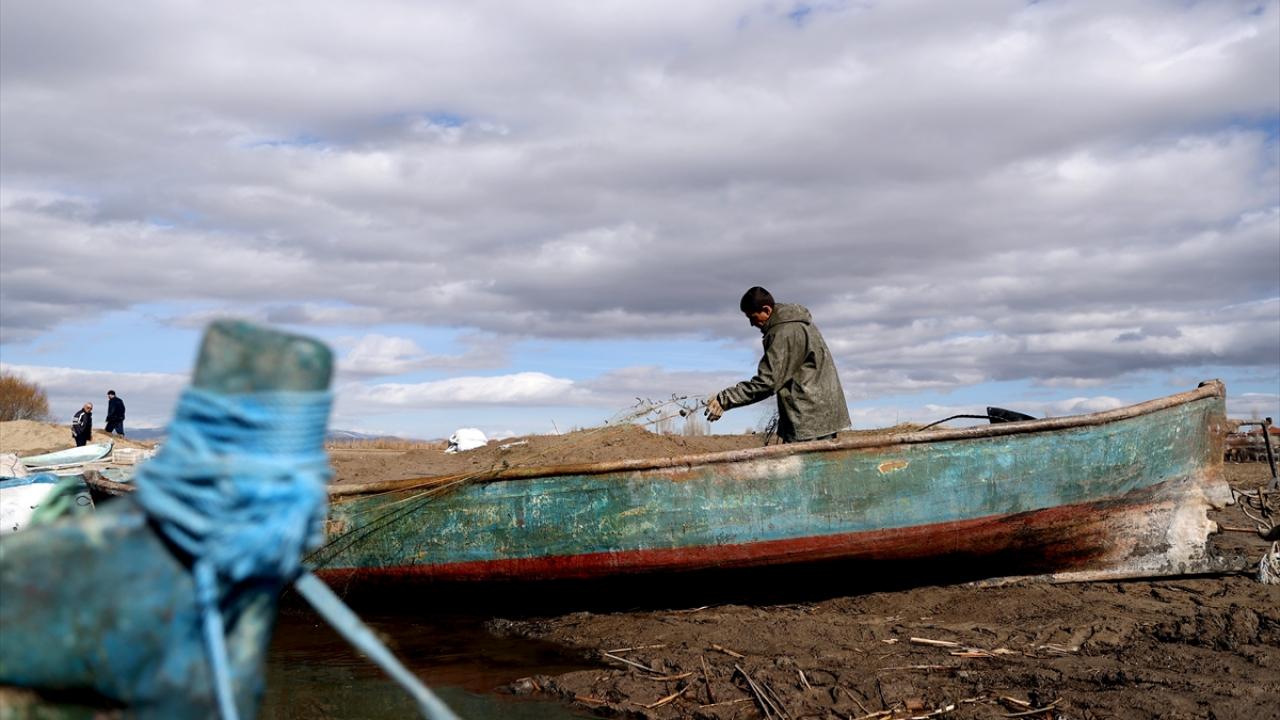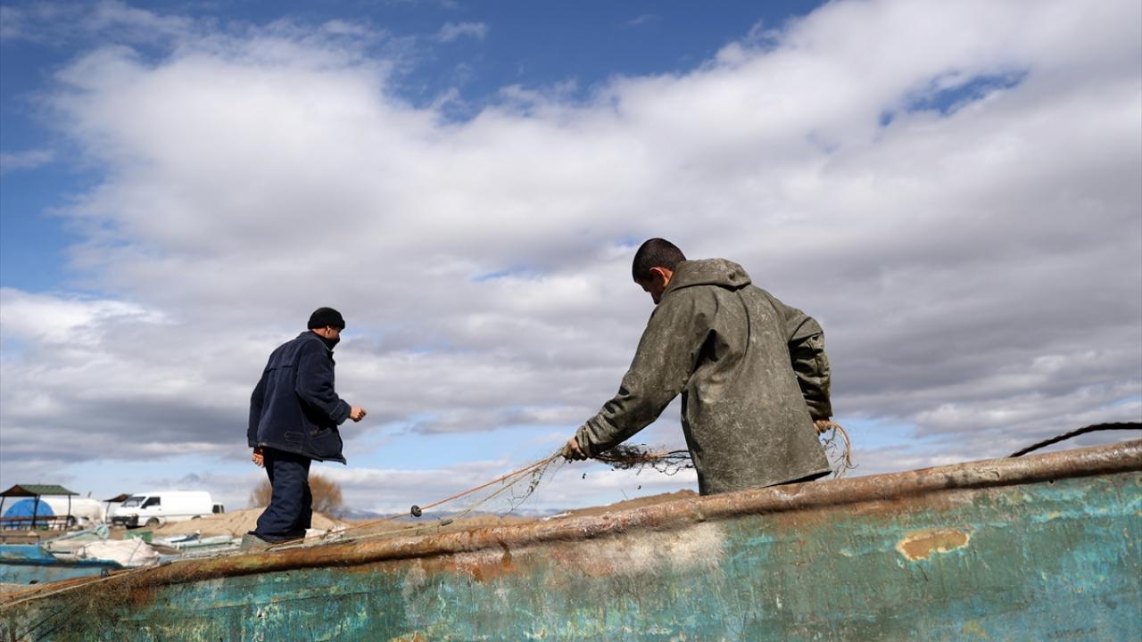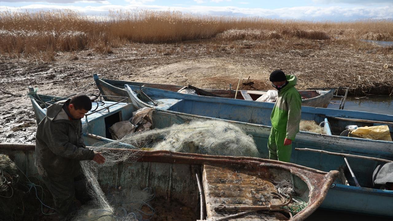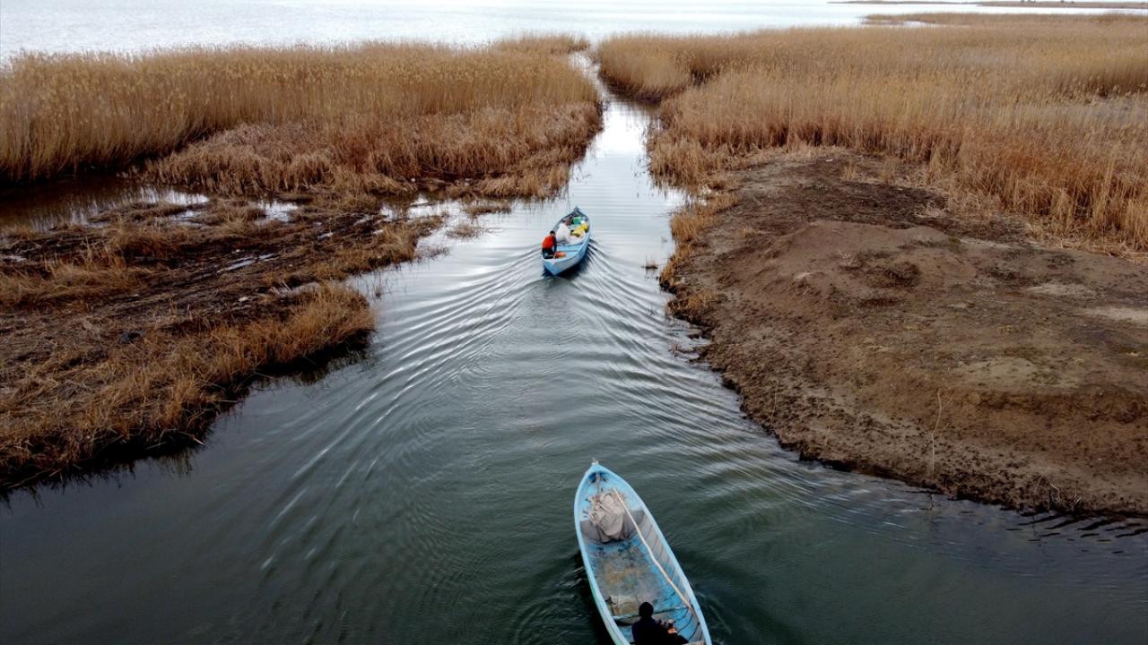 Mahalledeki balıkçılar, kendi imkanlarıyla yaptıkları küçük limandan gölün uzak noktalarına kadar ağlarını serdikten sonra, avın bereketli geçmesini umut ediyor.