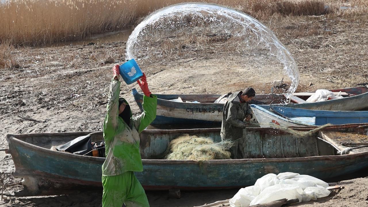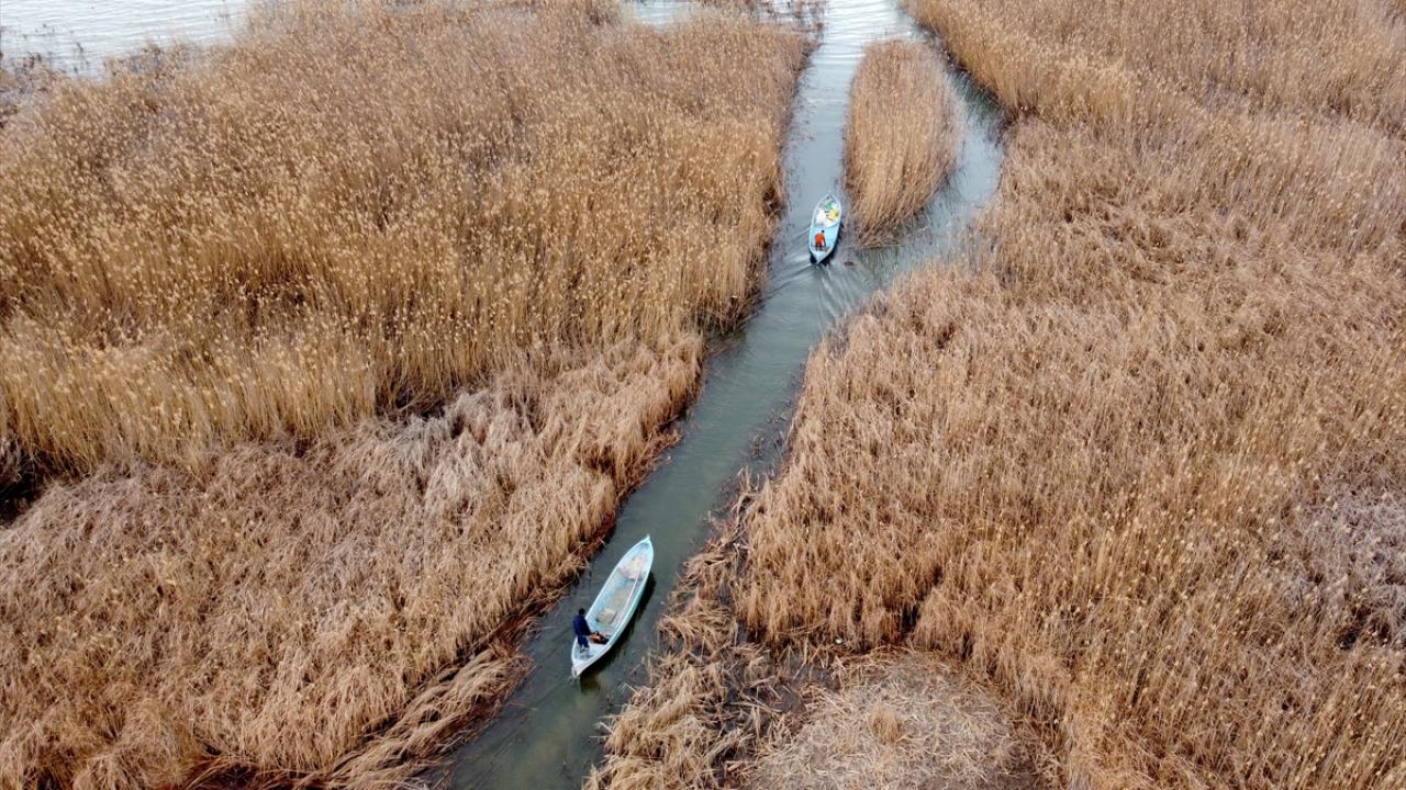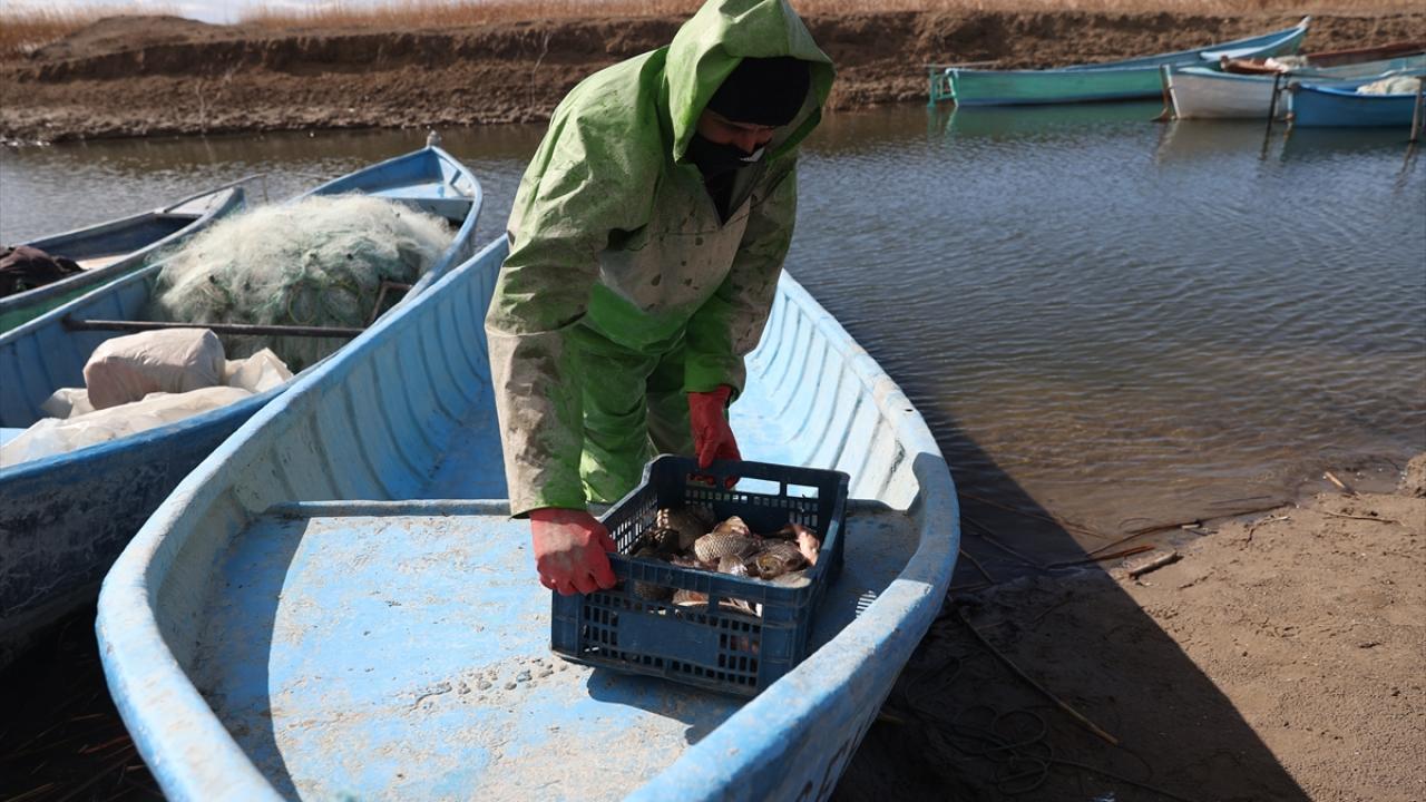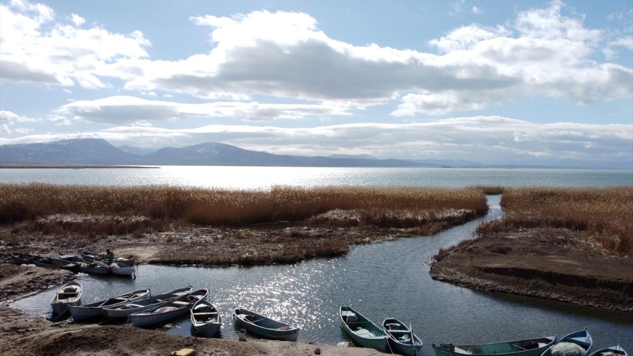 Mahalledeki balıkçılar, kendi imkanlarıyla yaptıkları küçük limandan gölün uzak noktalarına kadar ağlarını serdikten sonra, avın bereketli geçmesini umut ediyor.