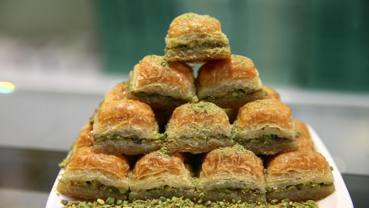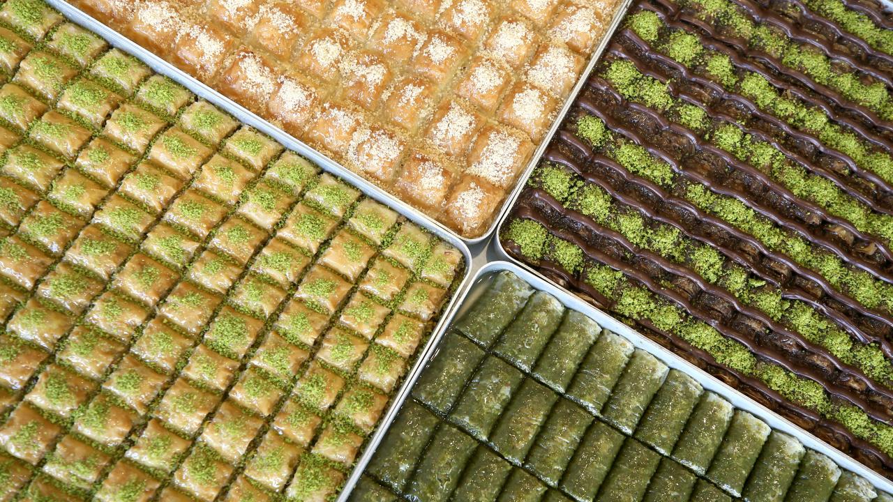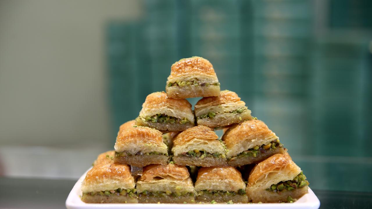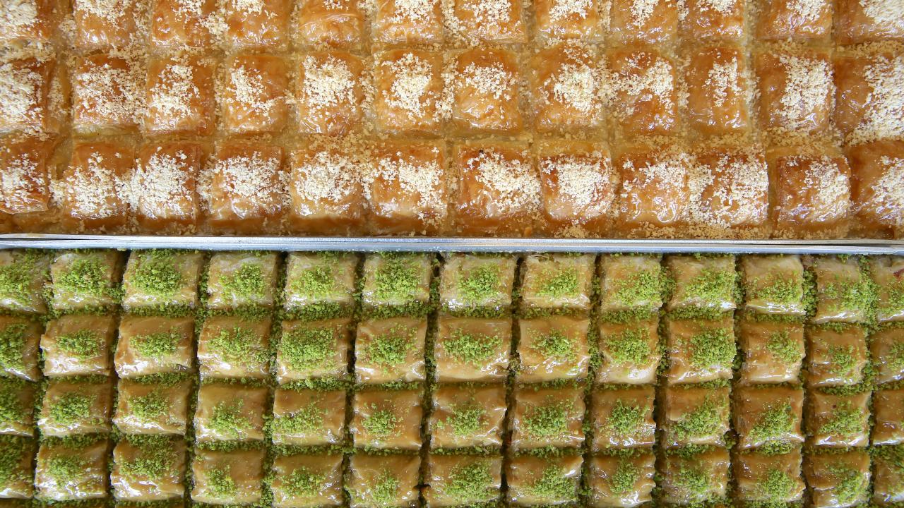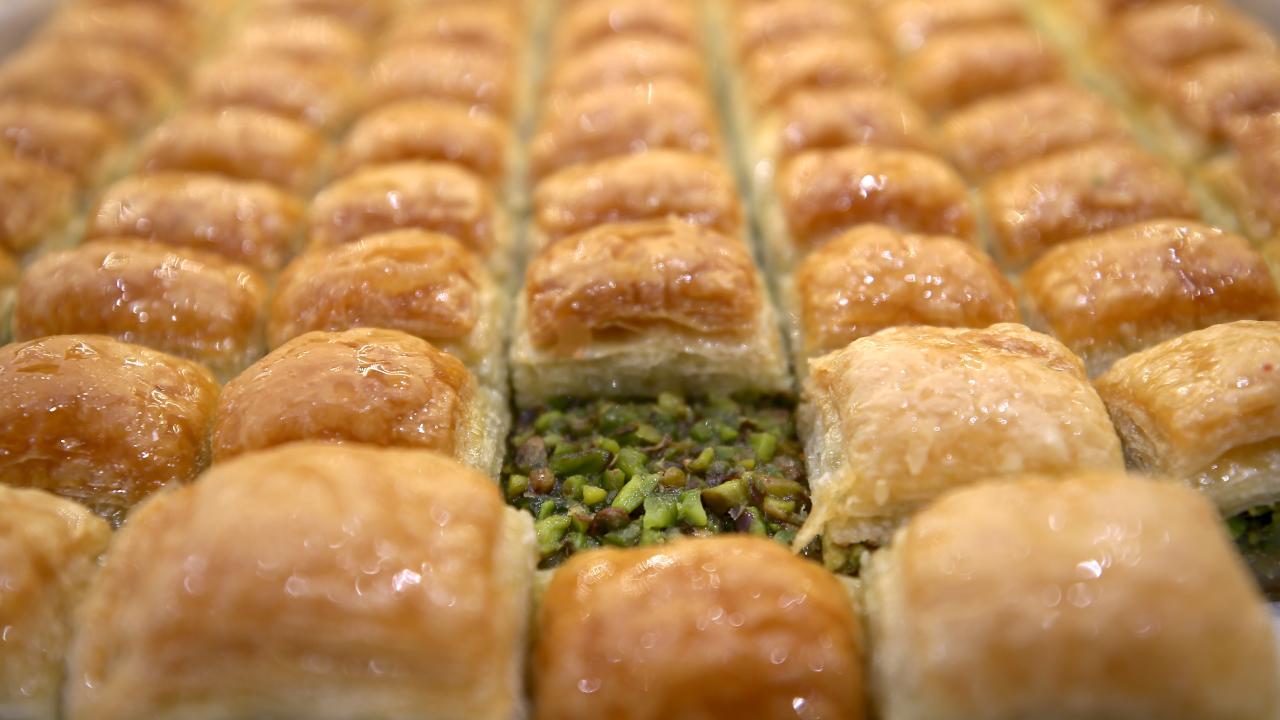 Ustaların hünerli elleriyle hazırlanan tatlılar, tezgahlarda müşterilerin beğenisine sunuluyor.