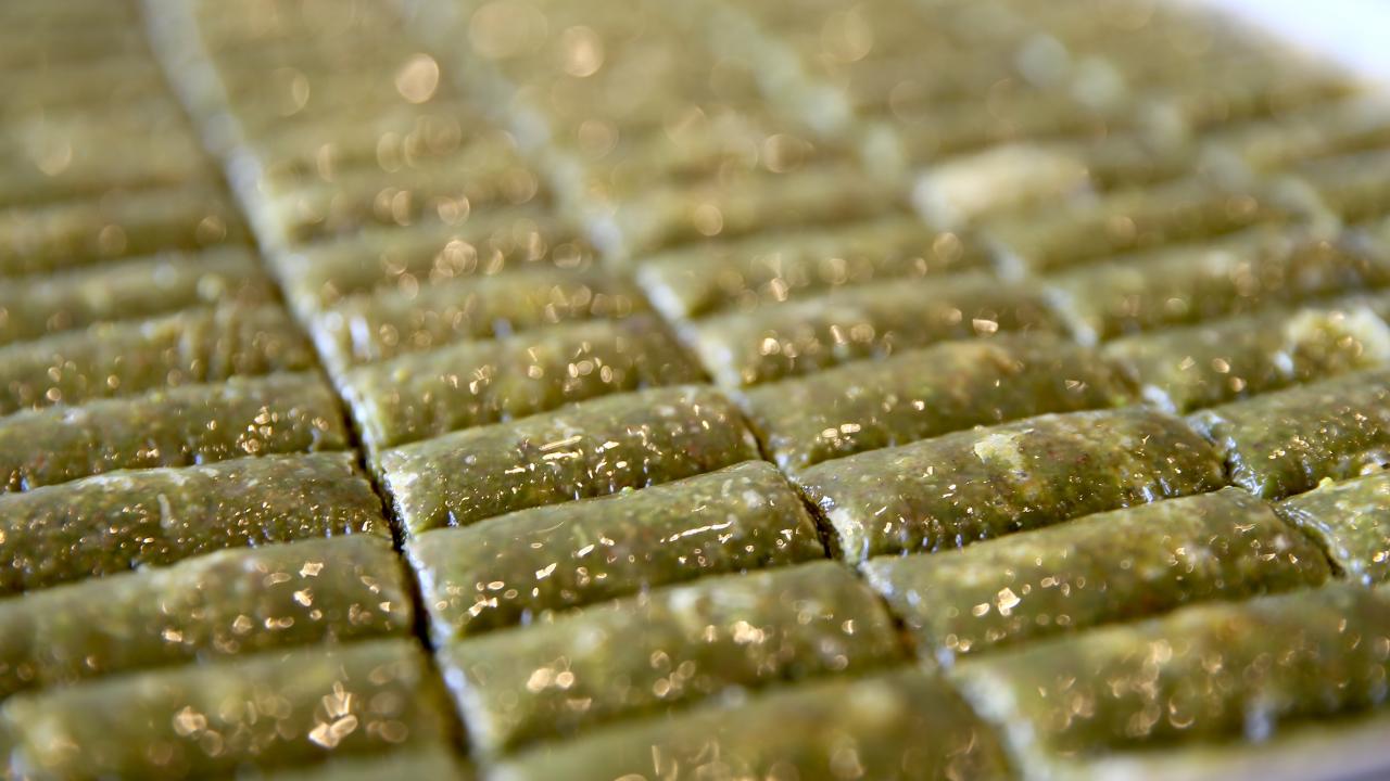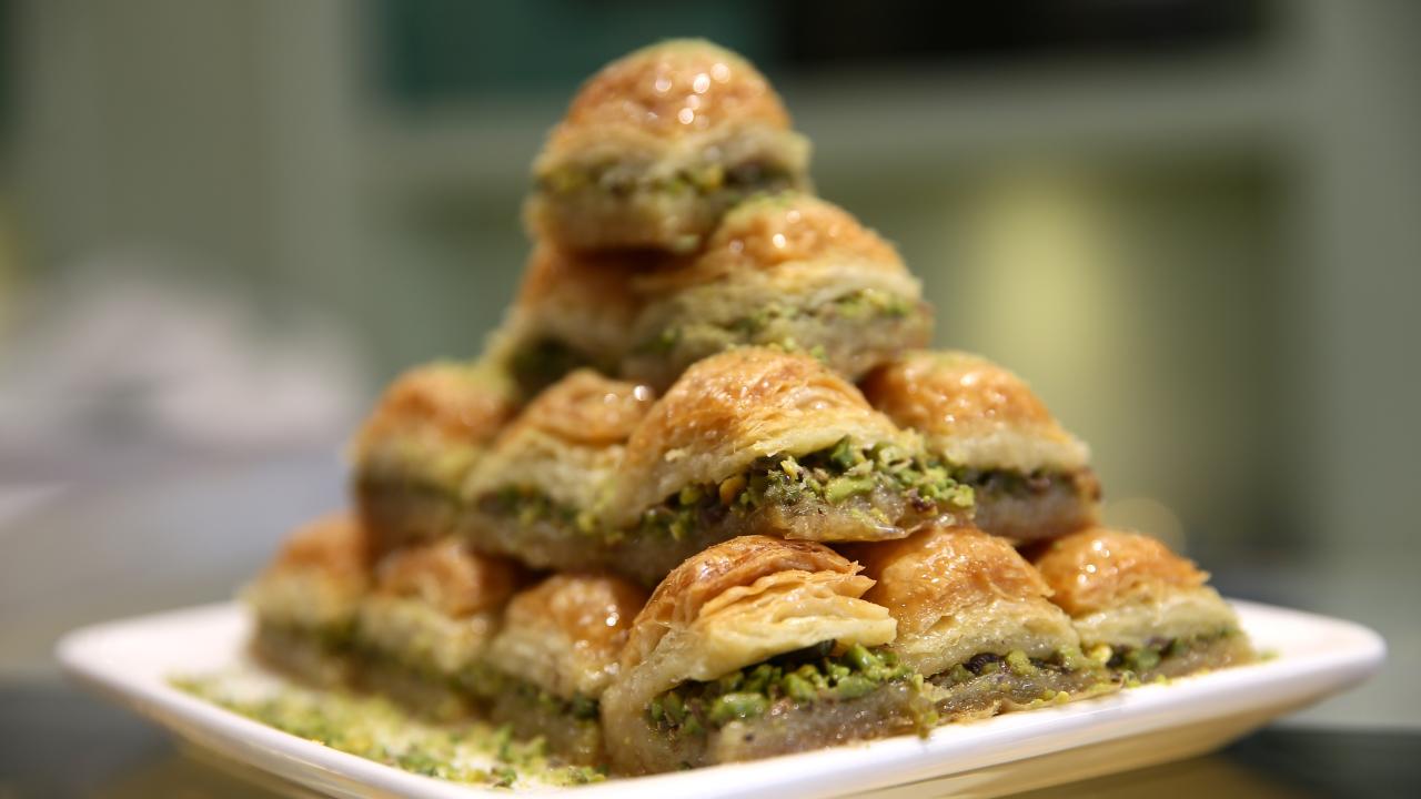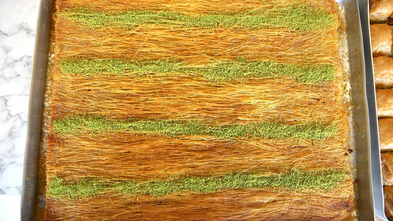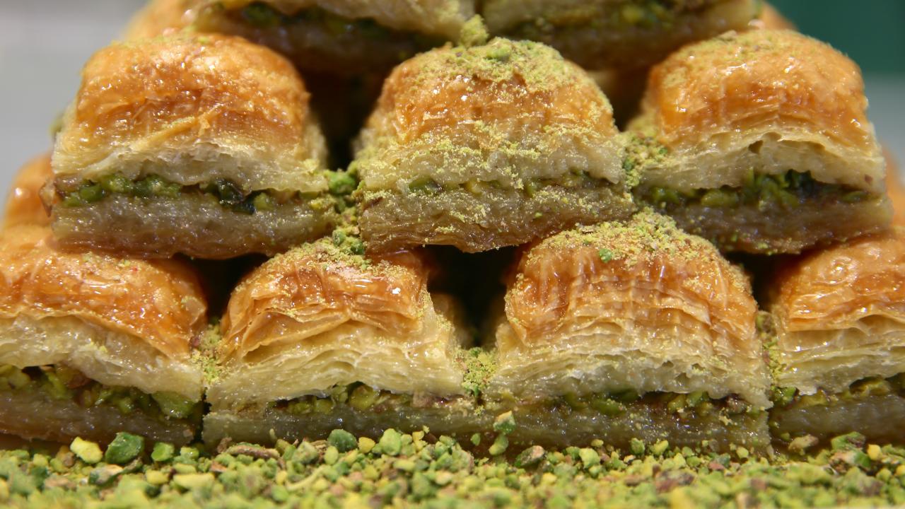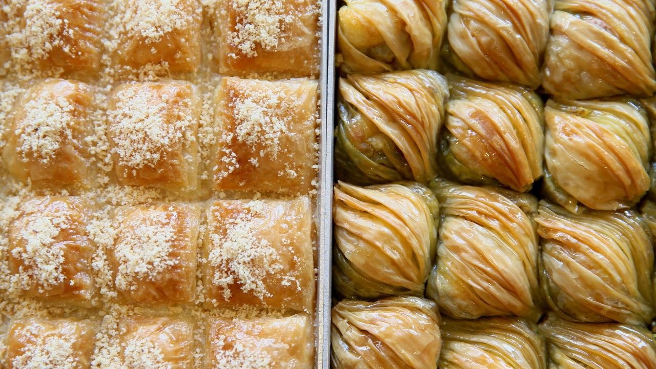 Ustaların hünerli elleriyle hazırlanan tatlılar, tezgahlarda müşterilerin beğenisine sunuluyor.