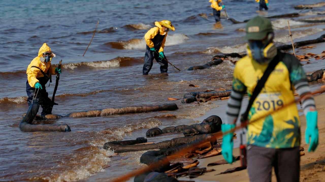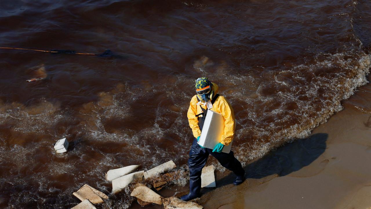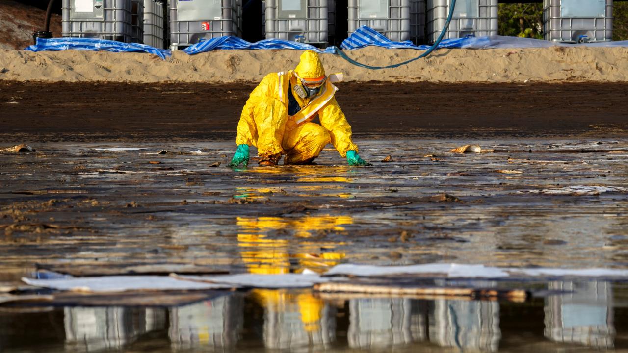 Uçaklar, petrolü dağıtmak için kimyasallar bırakırken, petrolün yüzeyden kayması ve temizlenmesi için yüzer setler yerleştiriliyor.