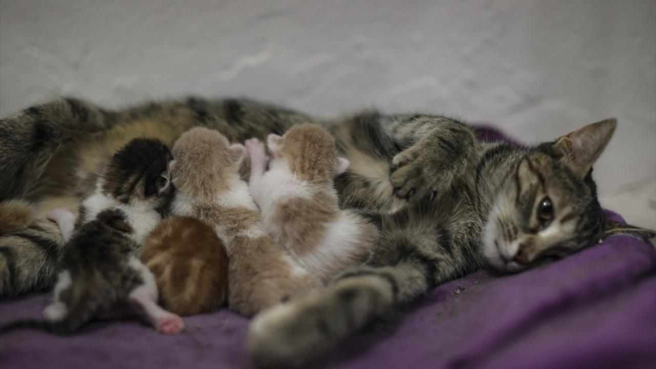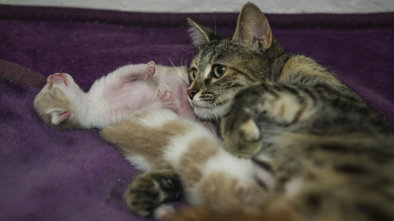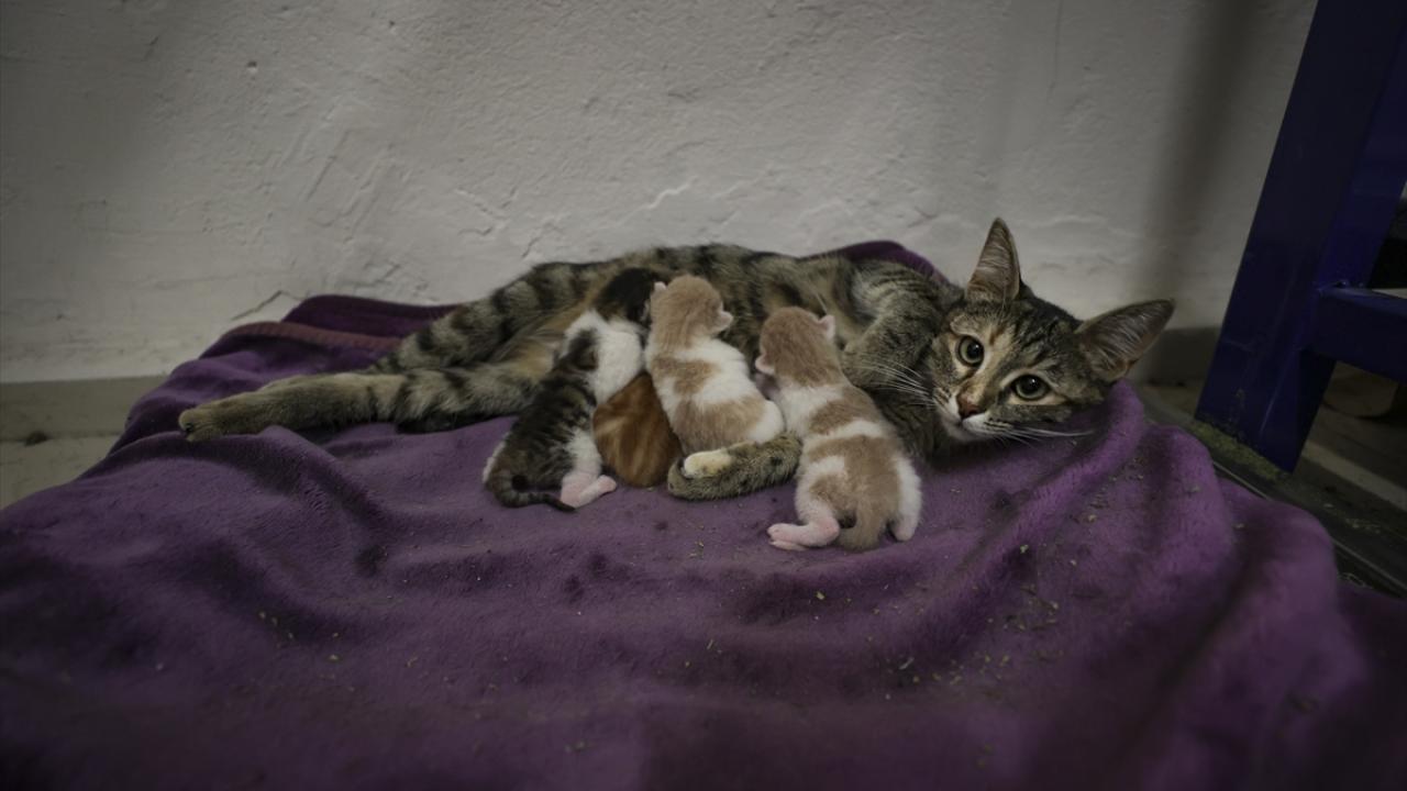 Kedilerin ihtiyaçları doğrultusunda beslenmelerini ve bakımlarını günlük takip eden ekipler, yeni doğum yapmış bir anne kedi ve yavrularıyla da özel ilgileniyor.
