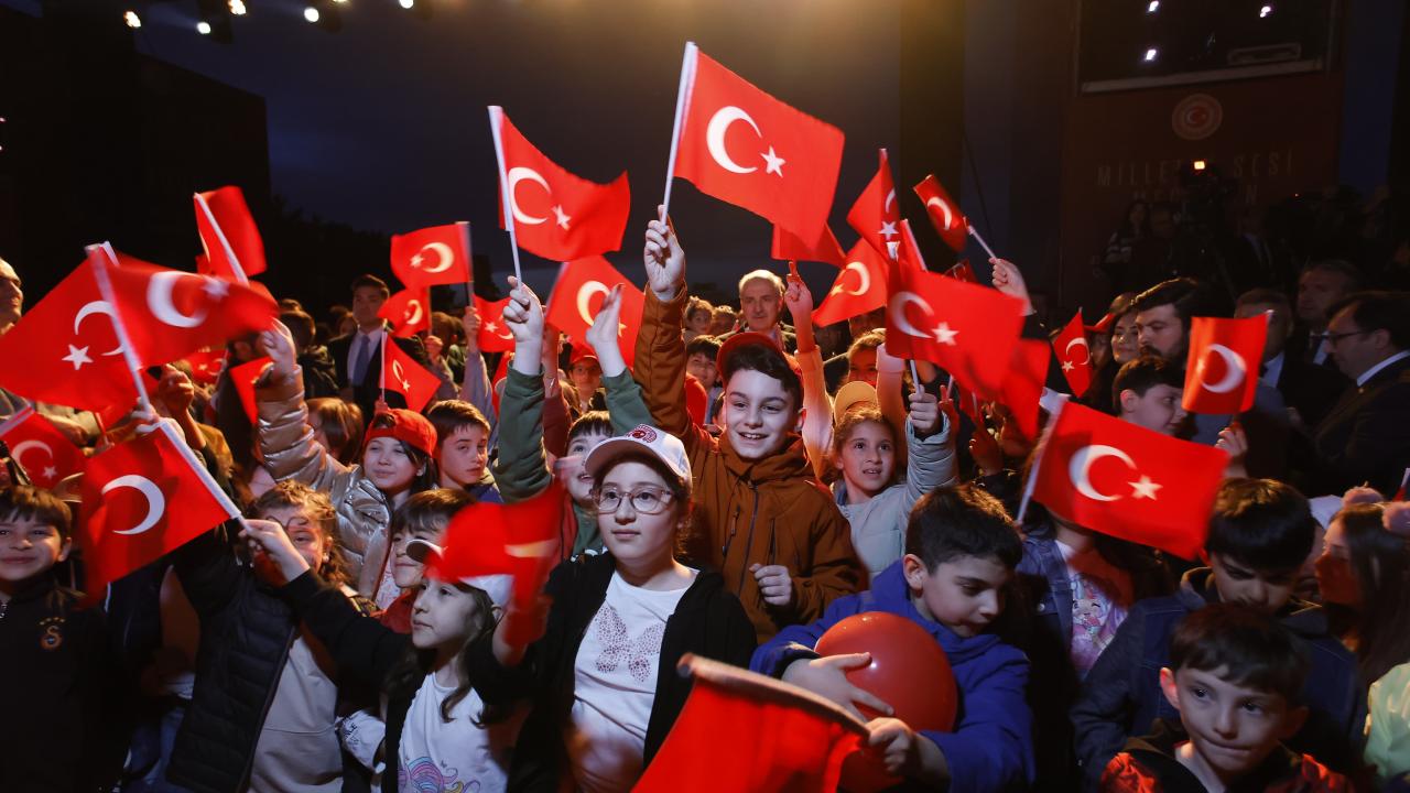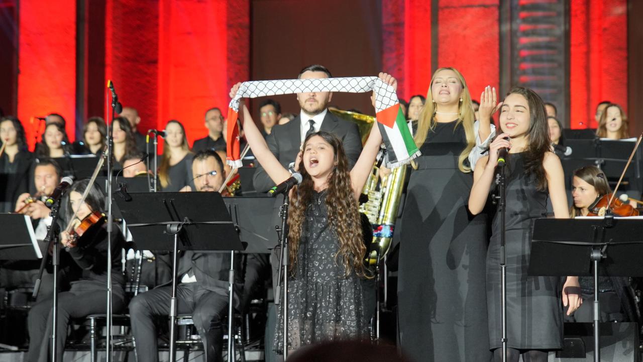 Konserde, Hacıoğulları`nın özel olarak bestelediği "23 Nisan Marşı" dört çocuk solist tarafından ilk kez seslendirildi. Marşın seslendirildiği sırada sahnede Filistin atkısı açıldı.