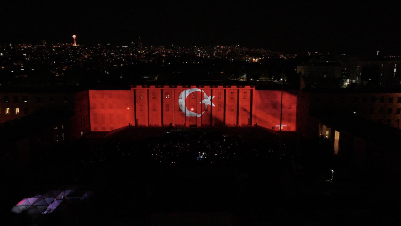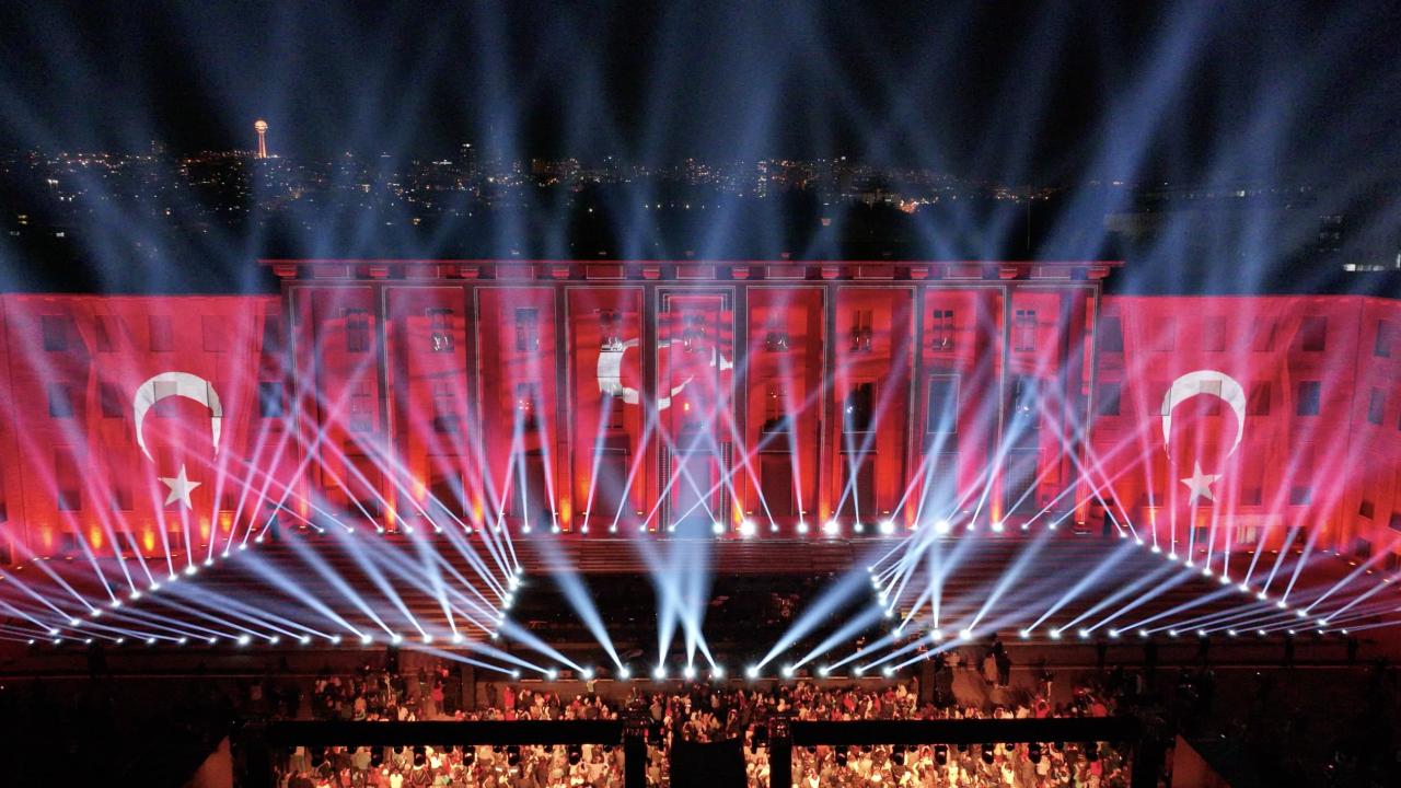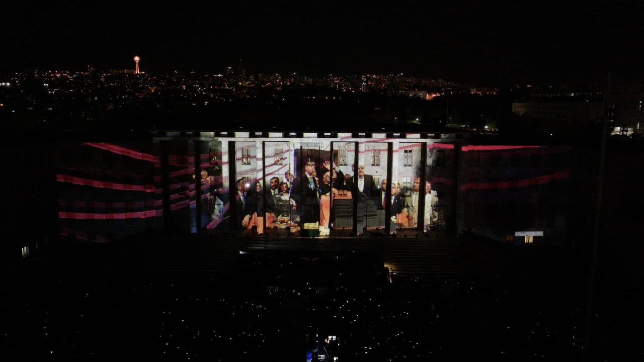 Yaklaşık 8 dakikalık ışık ve mapping gösterisinde, millet iradesine atıfta bulunularak "Hakimiyetin sahibi millettir" ifadesine yer verildi.