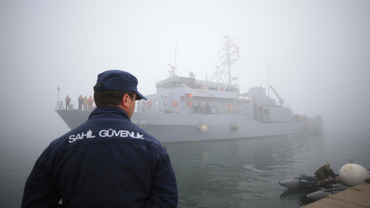 Halatlar yardımı ile limana bağlanan geminin bölgede mayın arama faaliyetlerine yarın devam edeceği açıklandı.