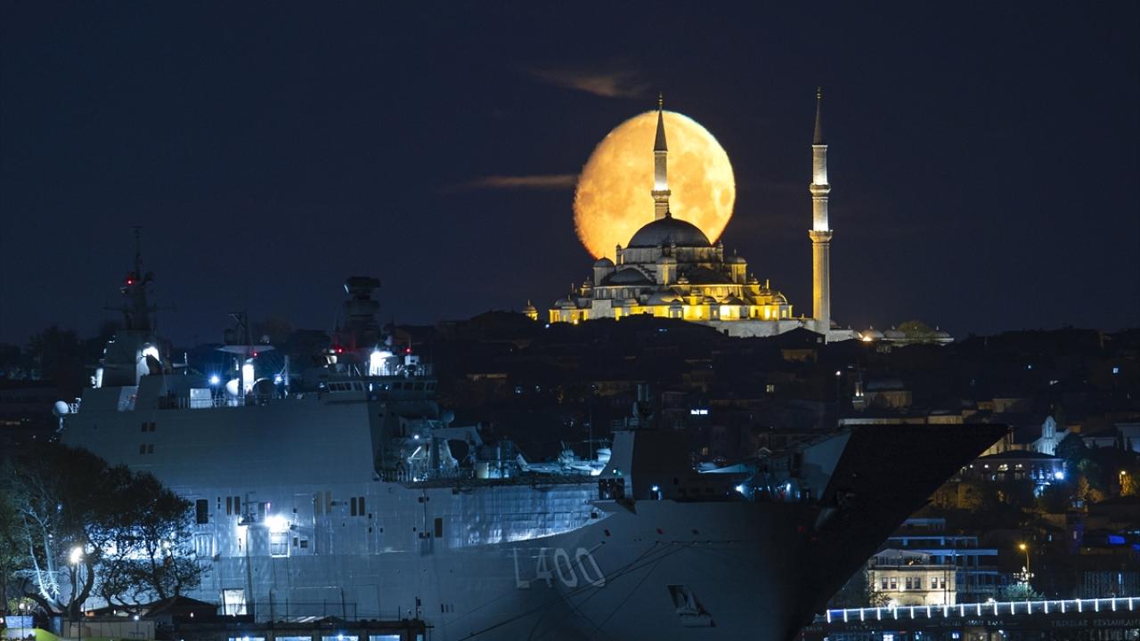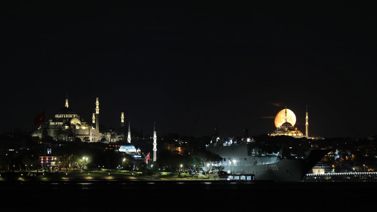 TCG Anadolu gemisi, Süleymaniye Camisi, Fatih Camisi ve Ay, güzel görüntüler oluşturdu.