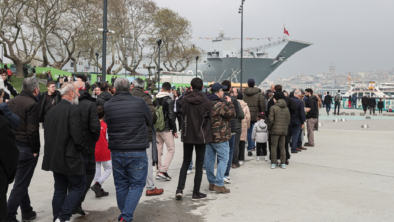 TCG Anadolu Gemisini ziyaret etmek için vatandaşlar kilometrelerce kuyruk oluşturdu