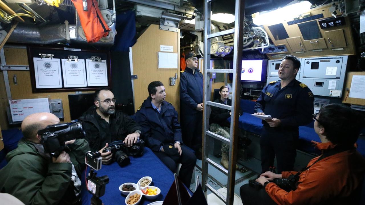 TCG Anafartalar Komutanı Deniz Yarbay Erce Yener ve 2. Komutan Deniz Binbaşı Alper Vural, geminin özelliklerine dair bilgi verirken, denizaltının bazı bölümlerini gazetecilere gösterdi.