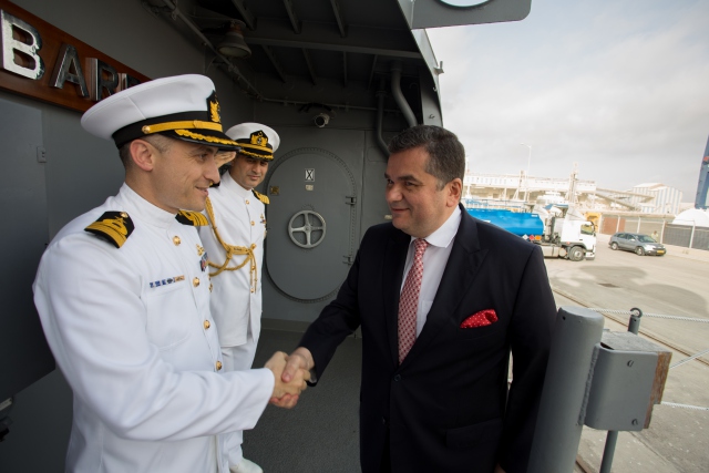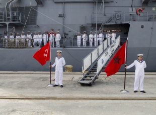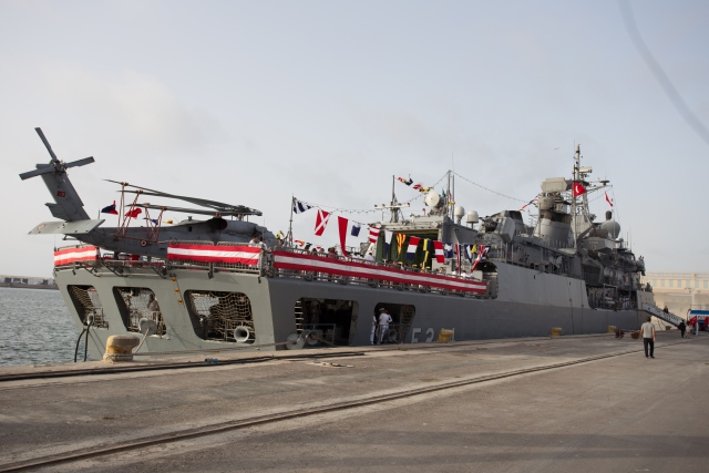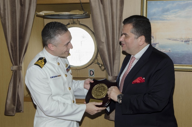Türkiye Cumhuriyeti Gemisi (TCG) Barbaros Fırkateyni Fas'ın en büyük kenti Kazablanka'ya demirledi. TCG Barbaros Fırkateyni'nin Fas ziyareti onuruna düzenlenen resepsiyonda Gemi Komutanı Deniz Kurmay Yarbay Mehmet Aytekin (solda), Türkiye’nin Rabat Büyükelçisi Ethem Barkan Öz (sağda) plaket takdim etti.
