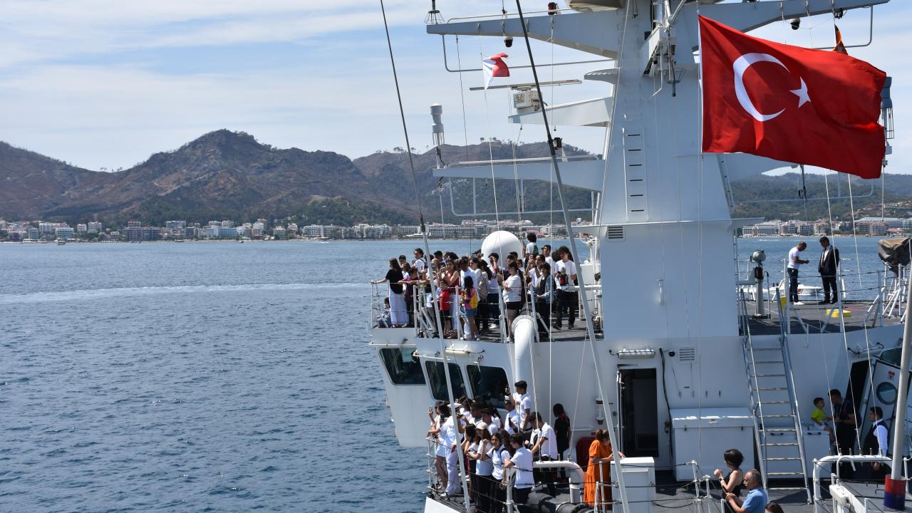 Sahil Güvenlik Güney Ege Grup Komutanı Yarbay Süleyman Ercan, Marmaris Deniz Ticaret Odası Başkanı Halil Bağlı, öğrenciler, öğretmenler ve ailelerin bulunduğu gemi Marmaris Körfezi`nde tur attı.