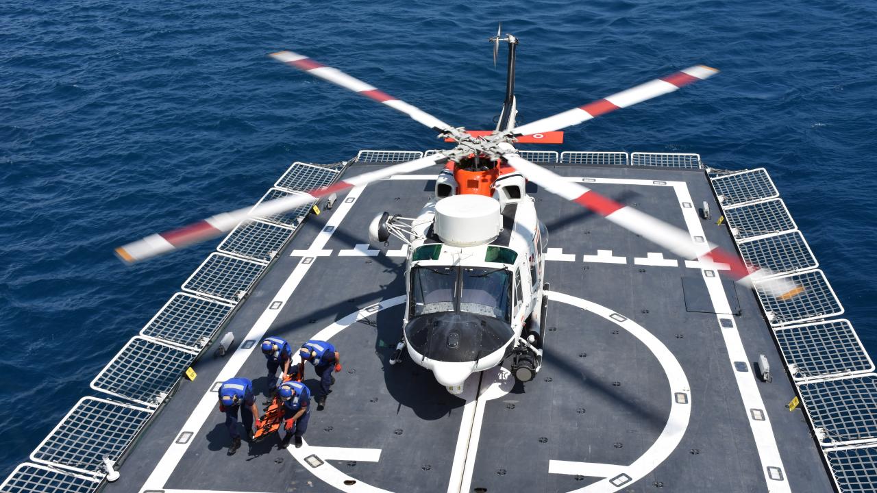 Bu sırada Sahil Güvenlik ekipleri arama kurtarma tatbikatı gerçekleştirdi. Senaryo gereği denize düşen birini kurtaran Sahil Güvenlik helikopteri gemiye iniş yaptı ve kazazedeyi gemi personeline teslim etti.