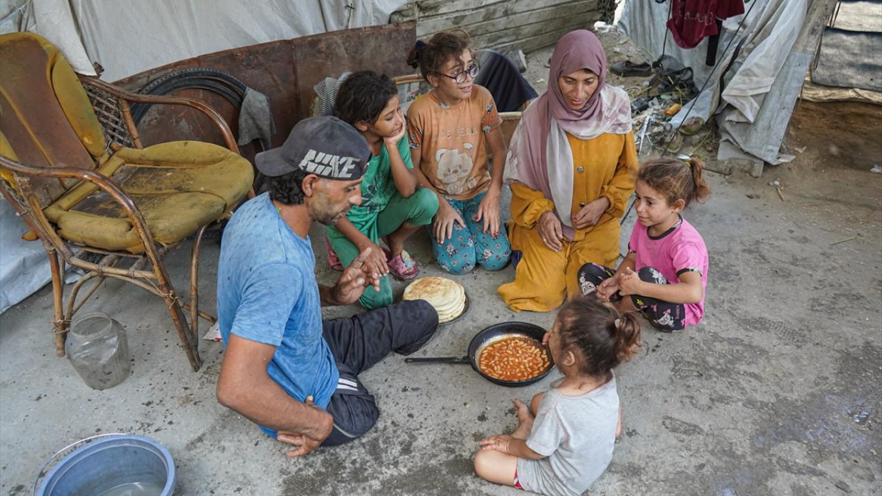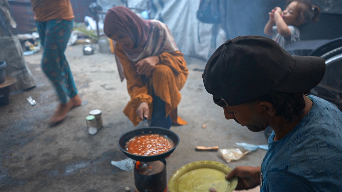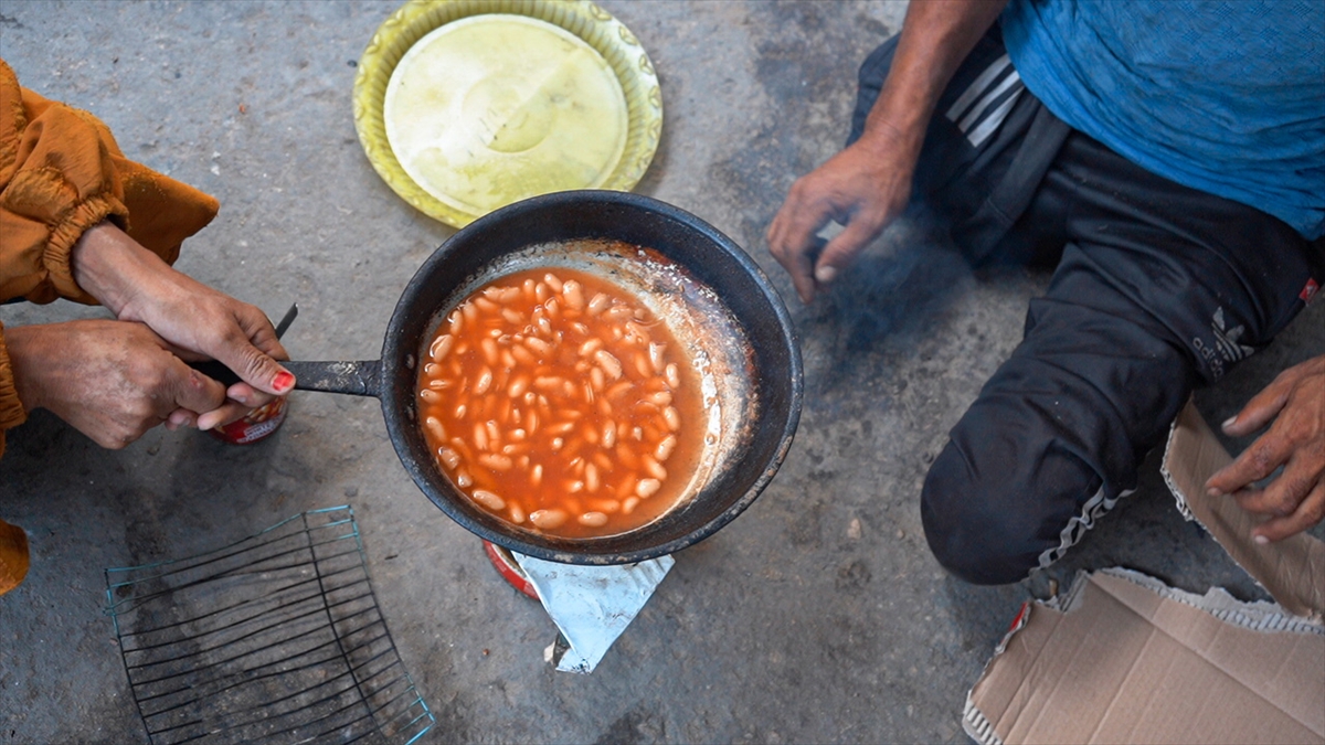 Yardım dağıtım noktasından getirdiği fasulye konservesini eşiyle birlikte yaktıkları ateşte ısıtan ve çocuklarıyla birlikte yiyen İbrahim, her gün bakliyat, un, mercimek, pirinç ve makarna gibi şeyler yediklerini ve 2 yıldır bunları yemekten usandıklarını dile getirdi.