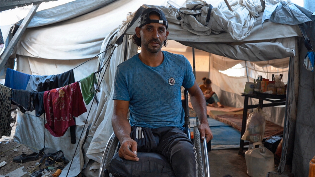 İsrail'in 2014 yılında Gazze'ye düzenlediği saldırılarda iki bacağını da kaybeden 37 yaşındaki İbrahim Abduddayim ölüm tehlikesine rağmen çocuklarının karnını doyurmak için tekerlekli sandalyesiyle ABD-İsrail güdümündeki sözde insani yardım dağıtım noktasına gitmek zorunda kalıyor.