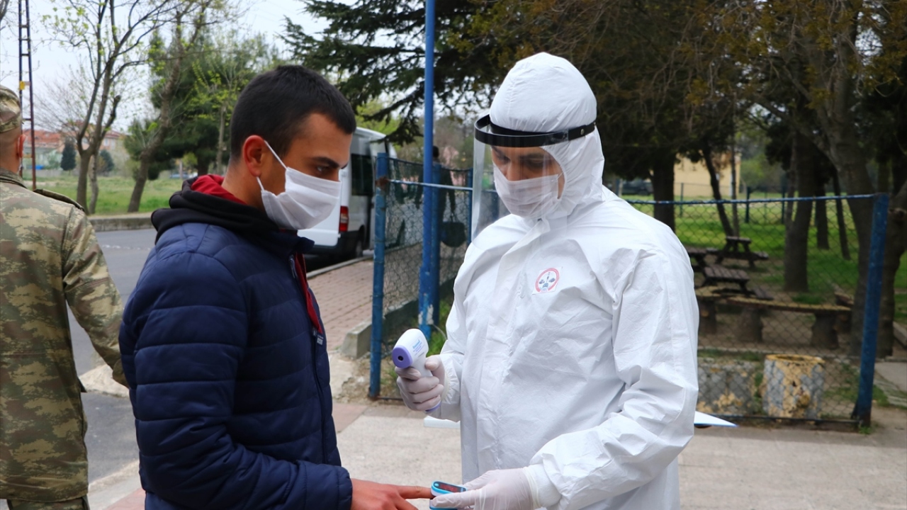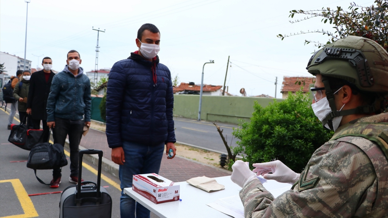 Komutanlık nizamiyesine getirilen erlerin tekrar ateş ölçümü yapılıyor, sağlık öyküsü ve yurt dışı hikayesi kaydediliyor.