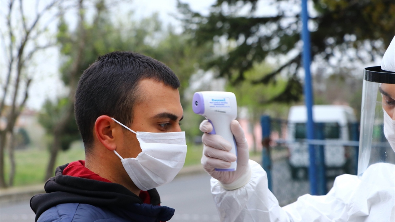 Sosyal mesafe kuralına uymaları konusunda uyarılan erlerin vücut ısıları, termal kameralarla ölçülüyor.