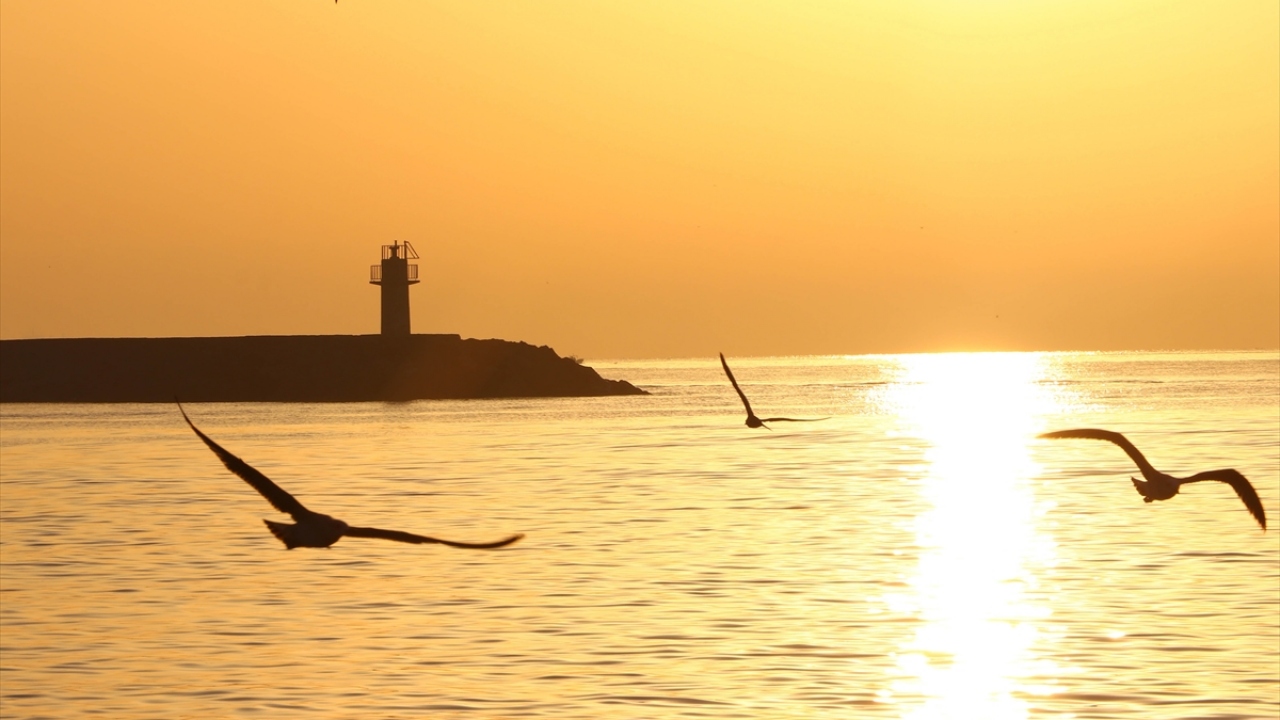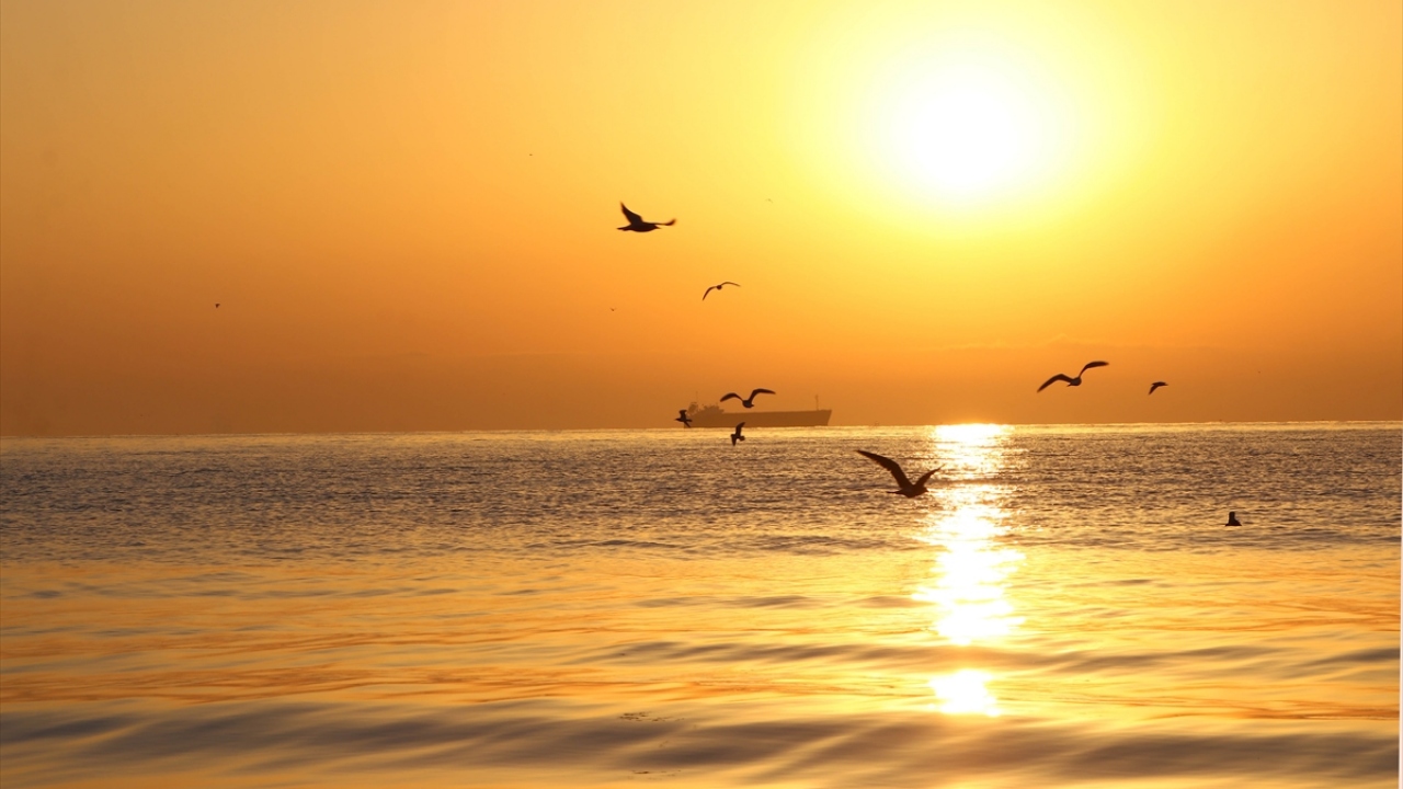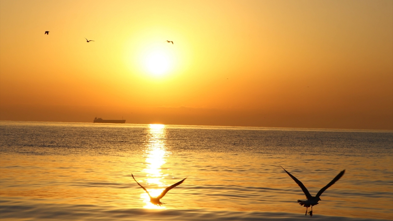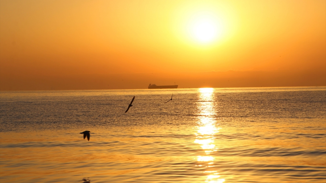 Tekirdağ'da gün doğumu, martılar ve açıkta bekleyen gemilerle birlikte güzel görüntü oluşturdu.