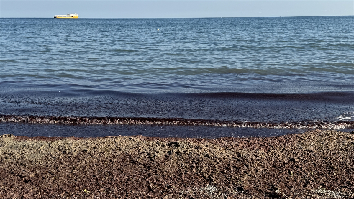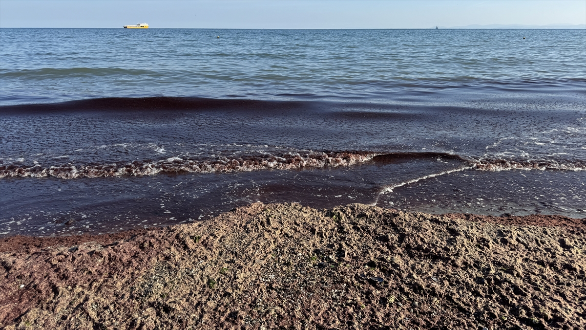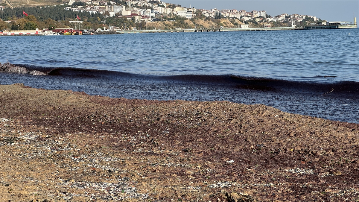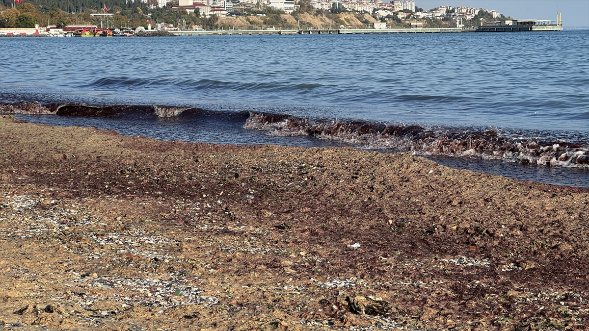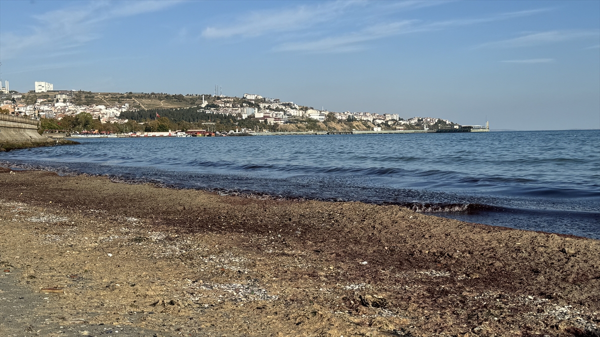 Tekirdağ'da kuvvetli rüzgar nedeniyle sahilin bir kısmı kırmızı yosunla kaplandı.