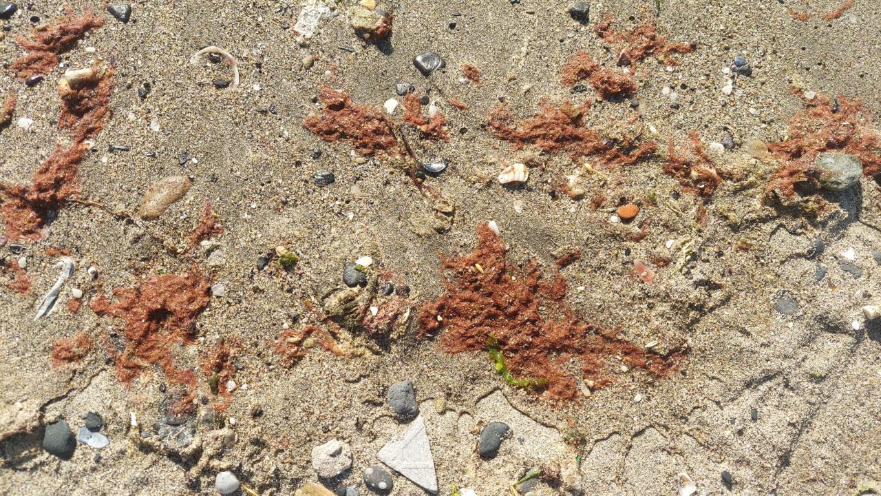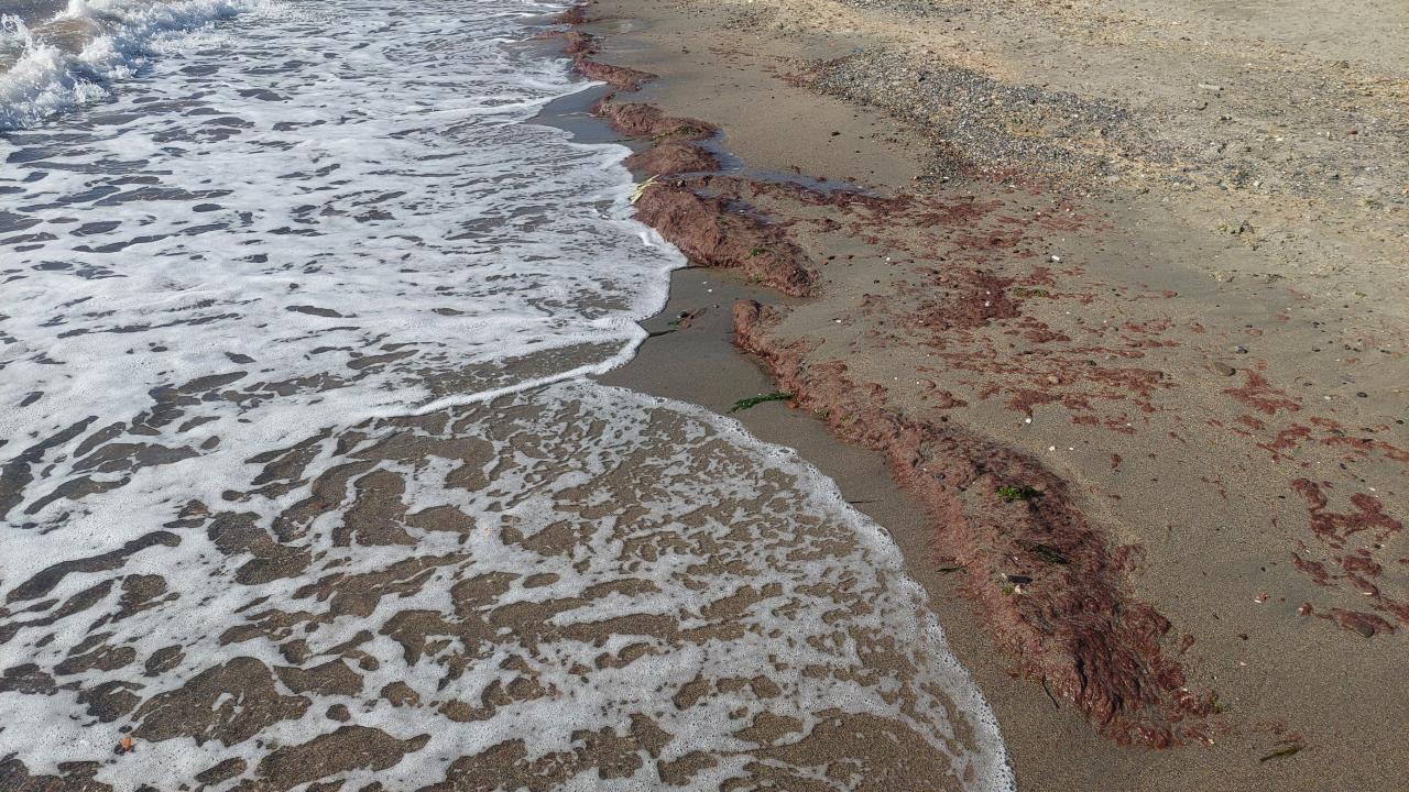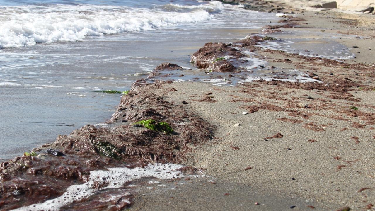 Sahildeki bazı alanlar da kırmızı yosunla kaplandı.