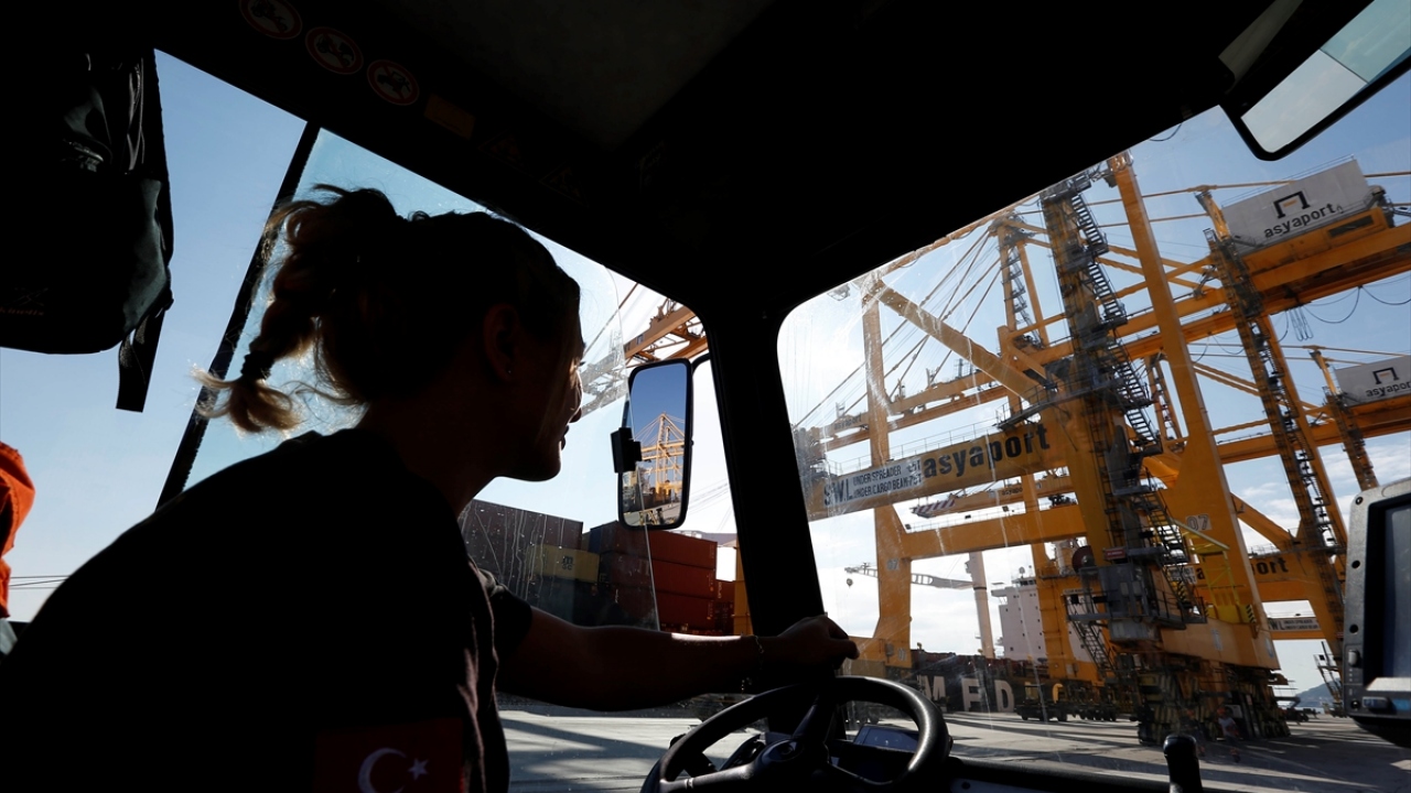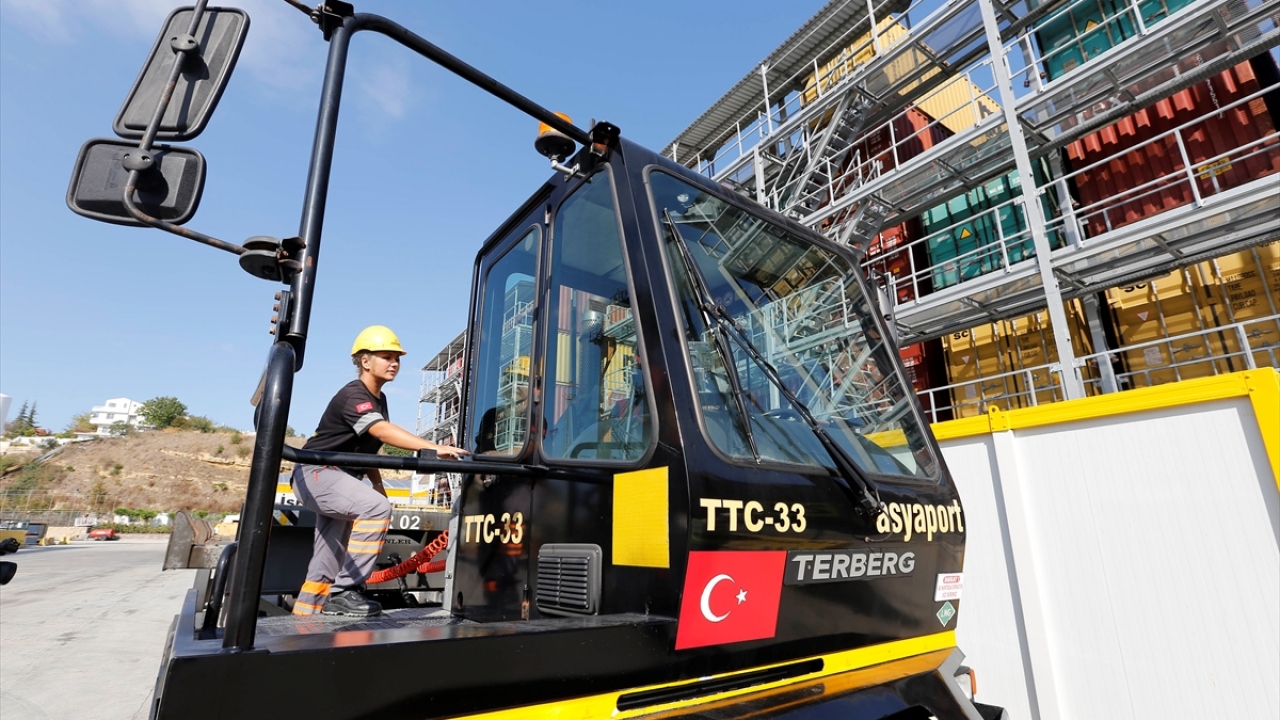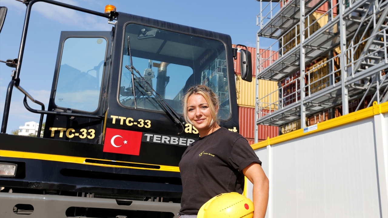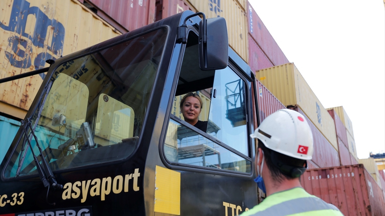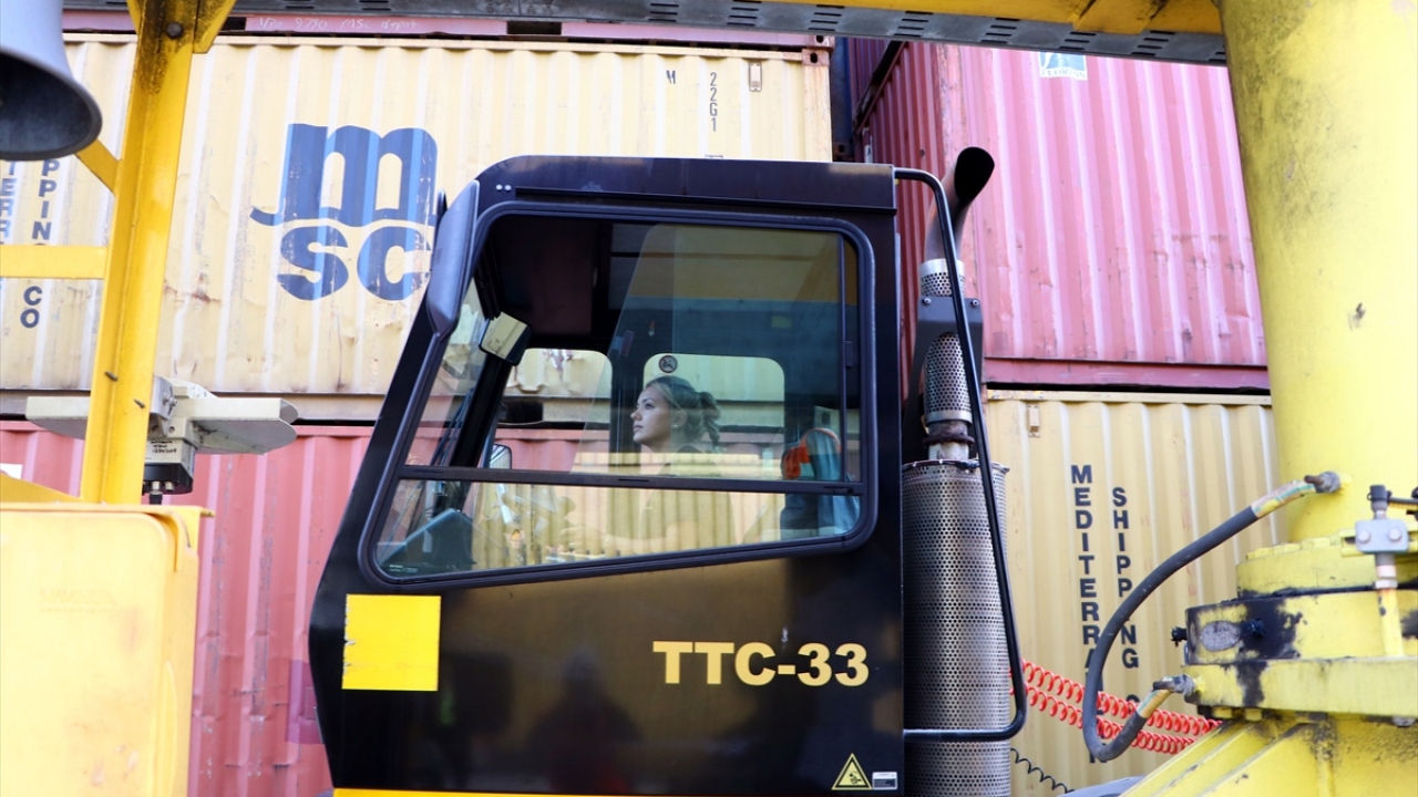 Tekirdağ Asyaport Limanı'nda gemilerden boşaltılan konteynerleri özel donanımlı araçla taşıyan operatör Elif Çevik, korkarak başladığı işinde usta oldu.