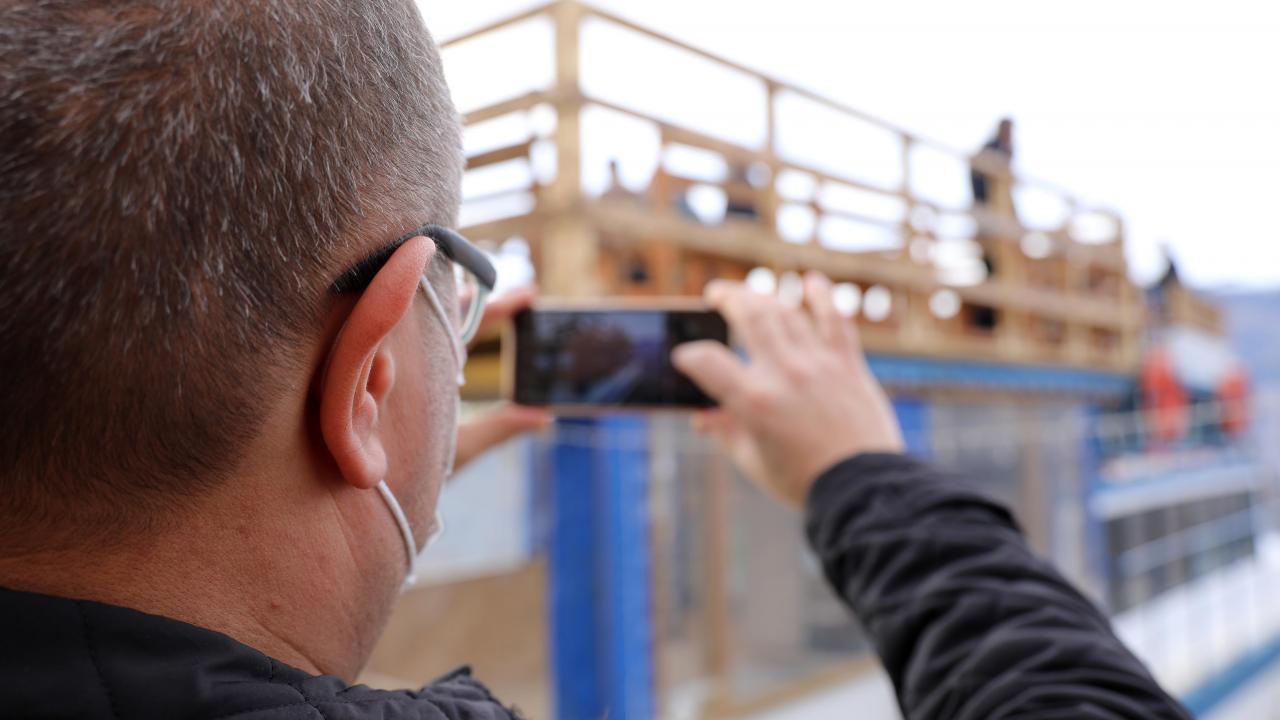 Zafer, deniz yoluyla Akçaabat ilçesine götürdüğü 15 metre uzunluğunda, yaklaşık 5 metre gövde genişliğindeki tekneyi, vinçle yüklendiği TIR`la karayolundan yörede 700 rakımlı mezra alanda Şahin Tepesi`ndeki tesisine taşıdı.