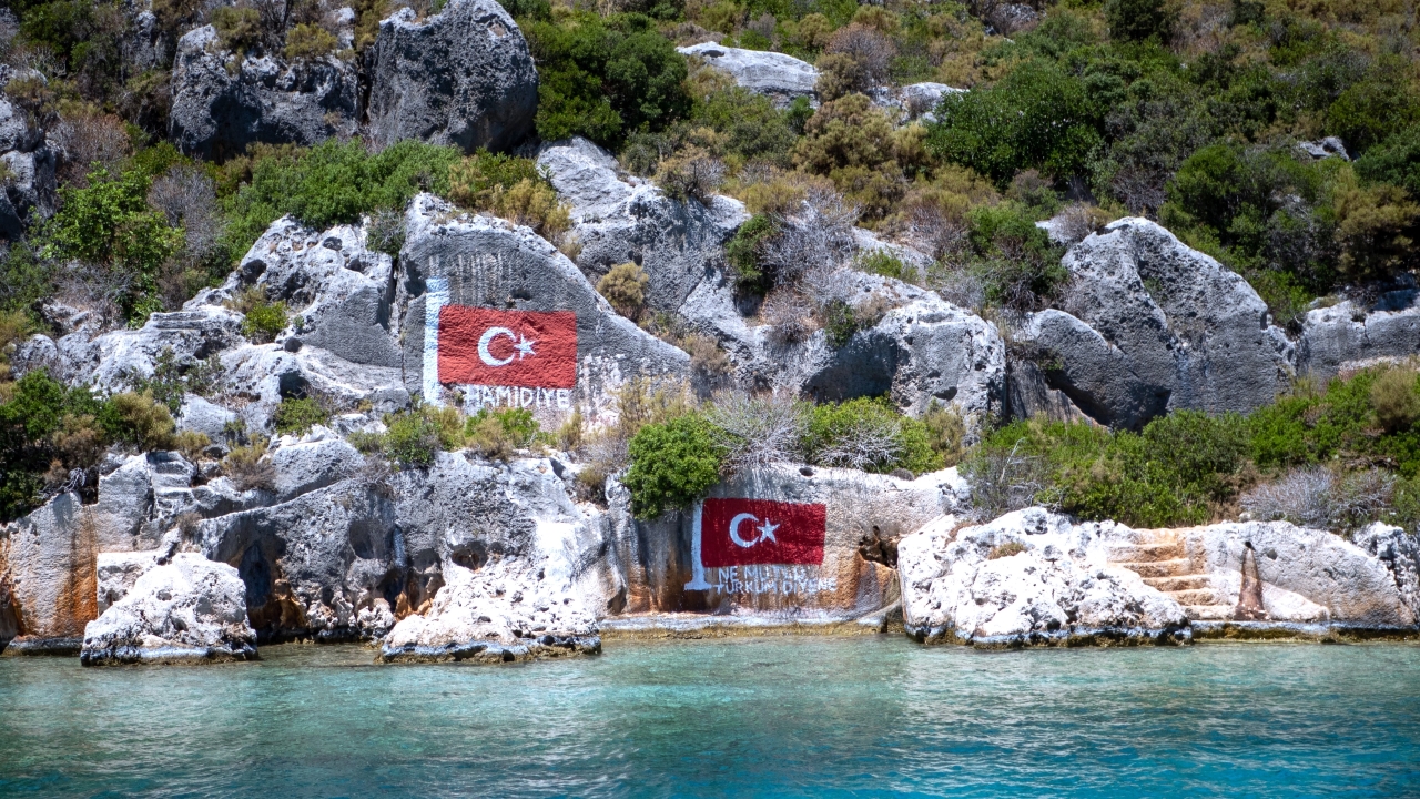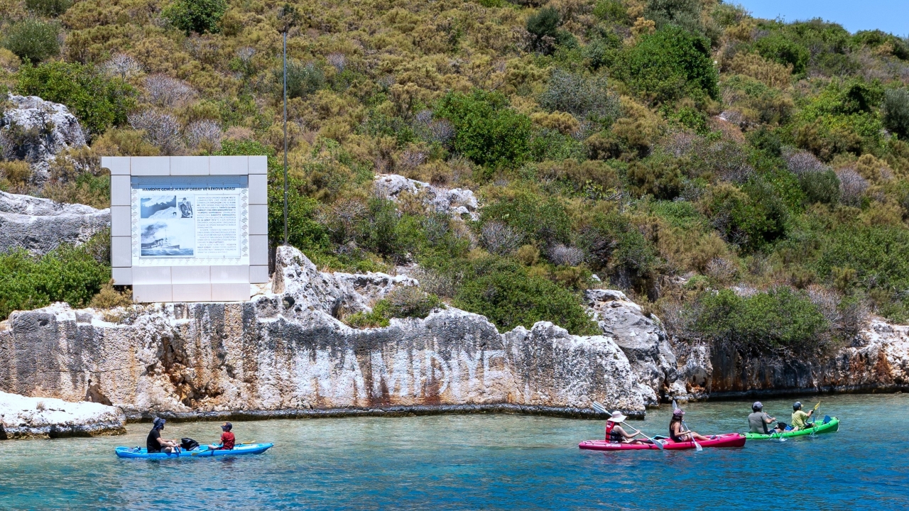 Türk denizcilik tarihinde önemli bir yere sahip koydaki anıtı ziyaret eden turistler daha sonra, Kekova Antik Kentinin bir kısmı sular altında kalmış kalıntıları üzerinde seyahat ediyor.