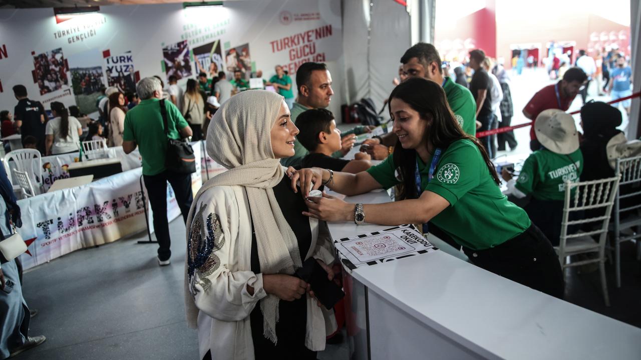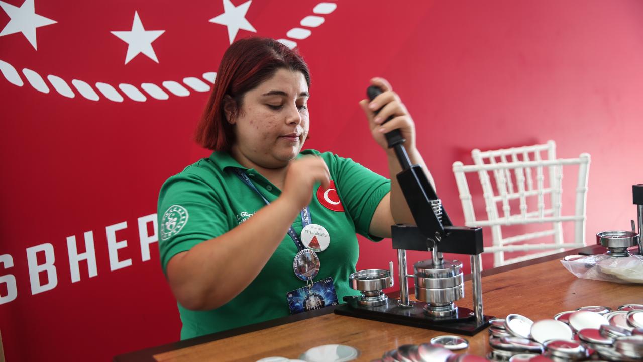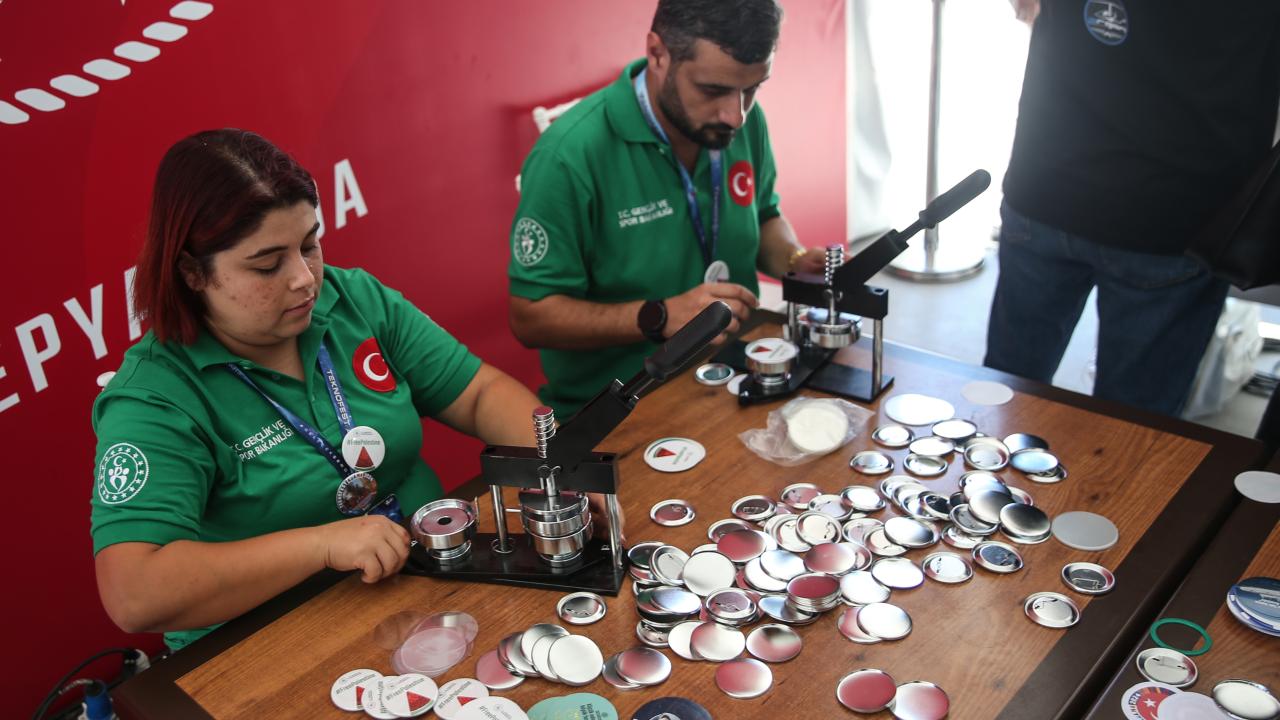 Festivale katılan Gençlik ve Spor Bakanlığına bağlı gençlik merkezlerinin liderleri, Filistin direnişinin sembollerinden "karpuz diliminin" yer aldığı rozetler hazırlıyor.