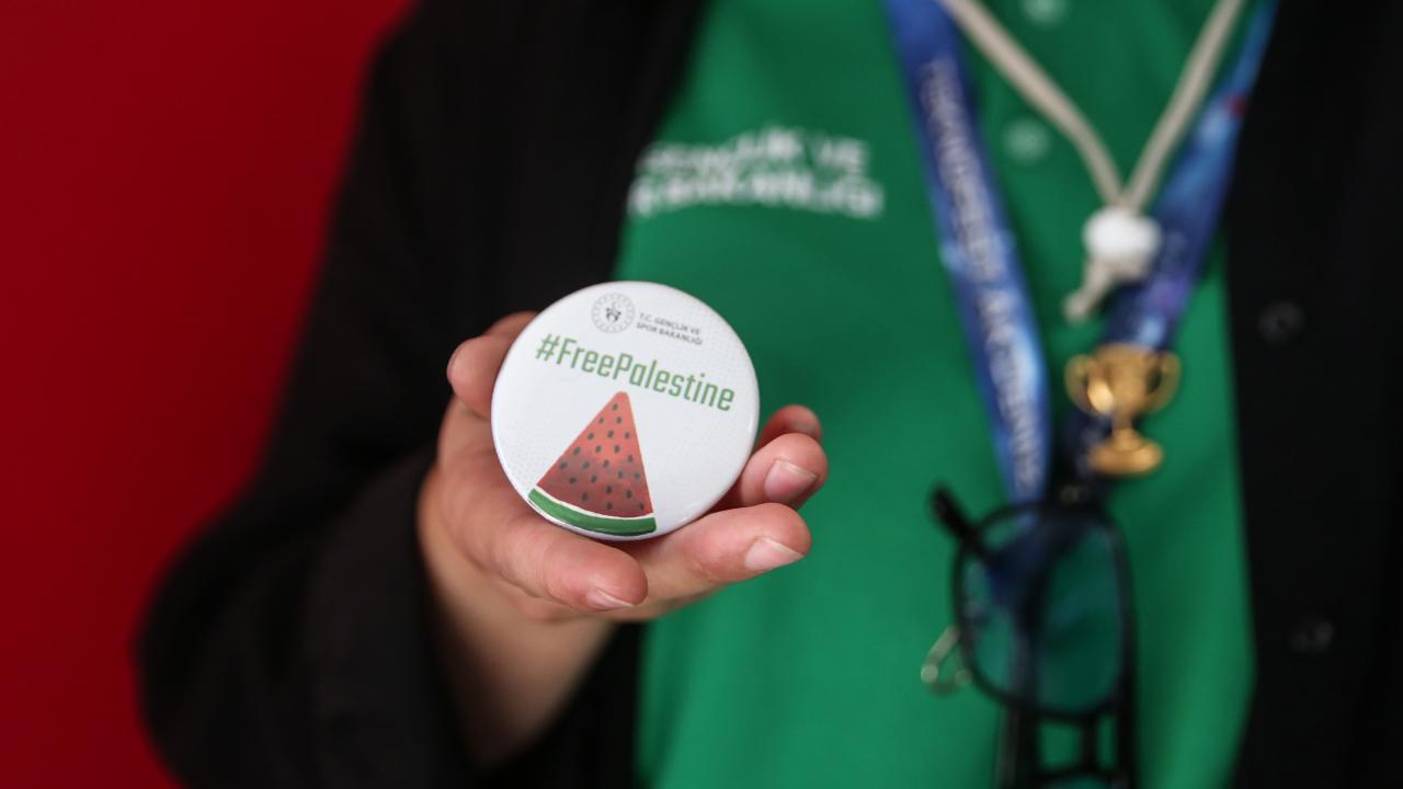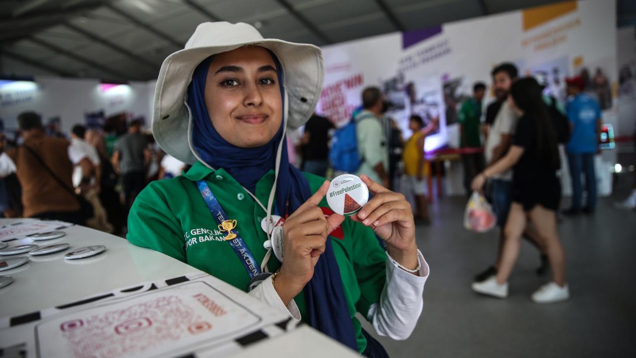 Gençler, stantlarını ziyaret eden katılımcılara "Özgür Filistin" anlamına gelen İngilizce "Free Palestine" yazılı rozetleri hediye ediyor.