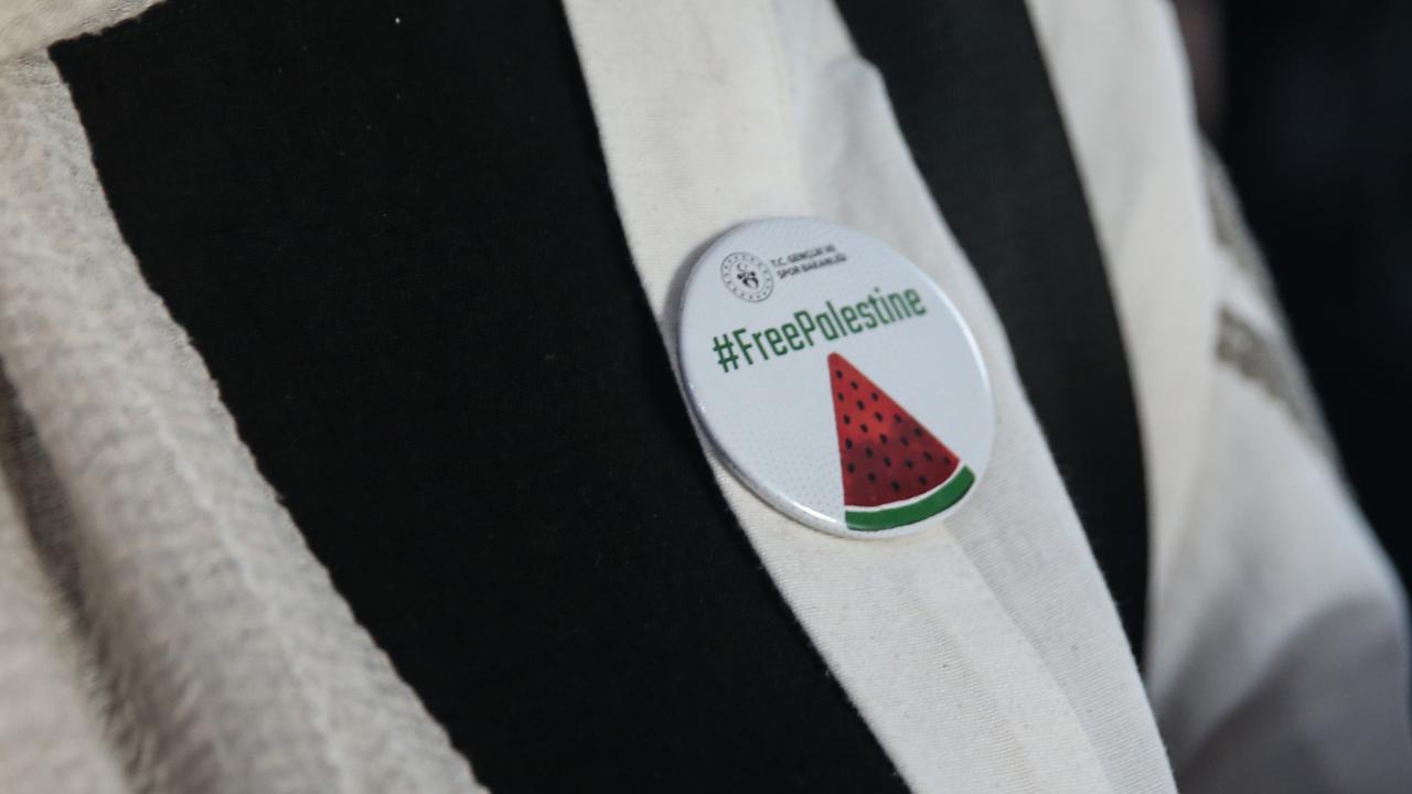 Ziyaretçiler, İsrail`in saldırılarını sürdürdüğü Filistin`e desteklerini göstermek için festival alanında bu rozetleri takıyor.