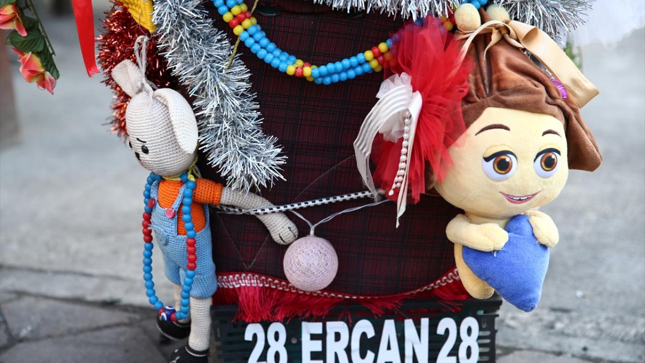 "En önce plakadan başladım, plaka olmazsa araba olmaz. Ondan sonra da bayrakları astım, oyuncuk bebekleri astım. Bir gelin arabası yanımdan geçti, içindeki kişi süslerini çıkardı, tabii ben kaçırır mıyım, süsleri aldım. Gelin arabası gibi yaptım, `Gelin arabası gibi süslemişsin arabanı` diyenler de var."