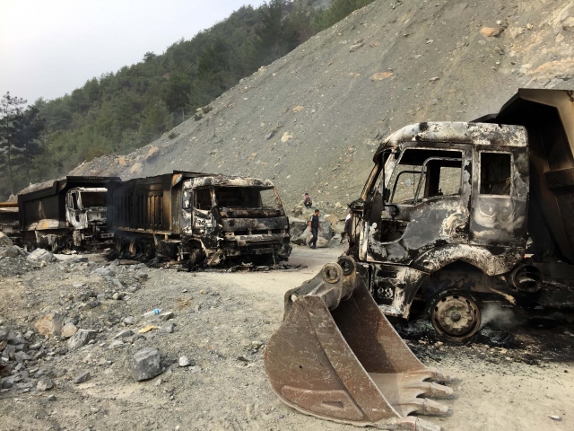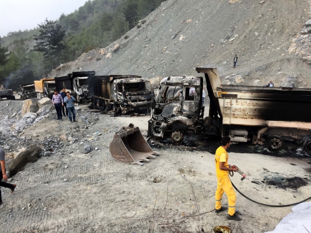 Amanos Dağları'nda, terör örgütü PKK mensupları, bir taş ocağına ait 11 kamyon ve bir iş makinesini ateşe verdi. Taş ocağında ateşe verilen 11 kamyon ve bir iş makinesinde ağır hasar oluşurken, güvenlik güçleri geniş çaplı operasyon başlattı.