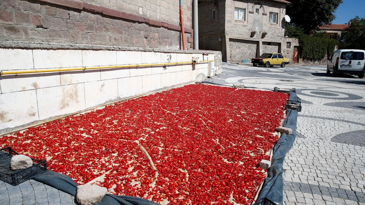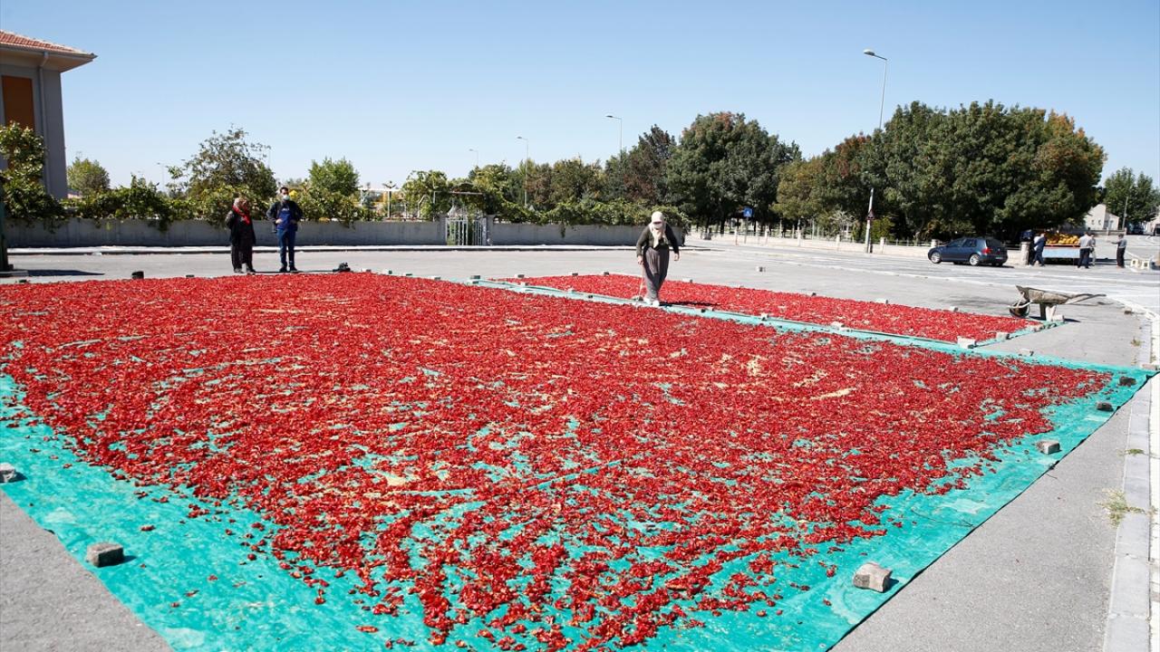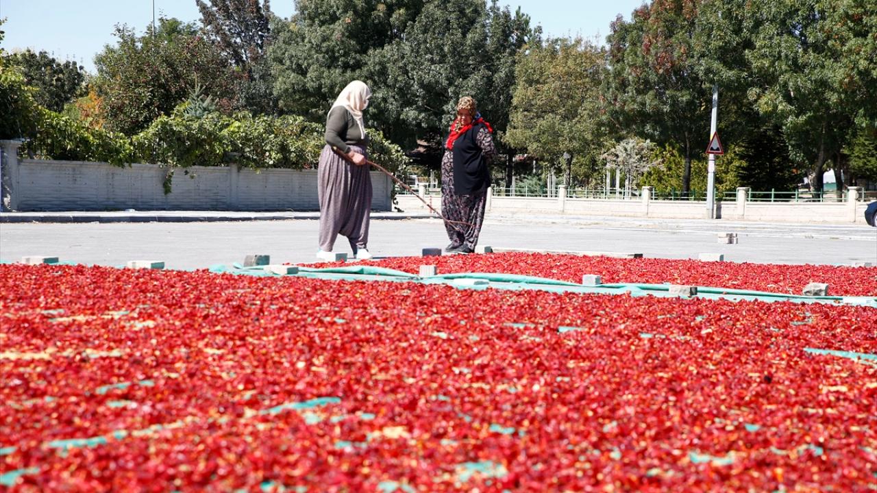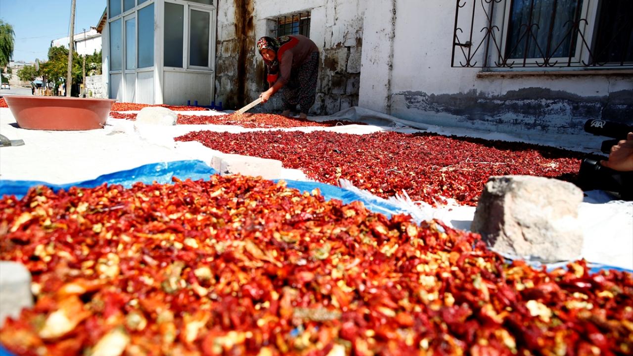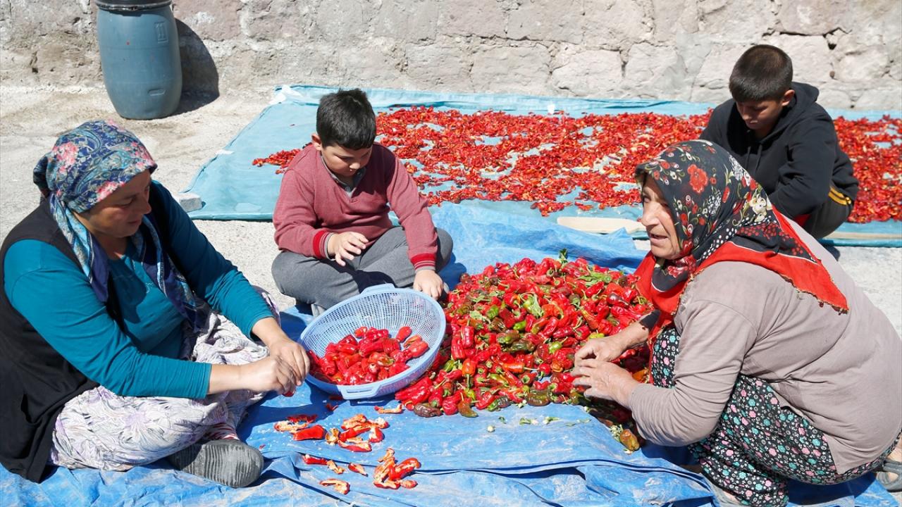 Kayseri'de bir mahallede yetiştirilen tescilli Cırgalan biberi, kadınlar tarafından ayıklanıp parçalara ayrıldıktan sonra çatılar, sokak araları ve mahalle meydanında kurutulmaya bırakılıyor.